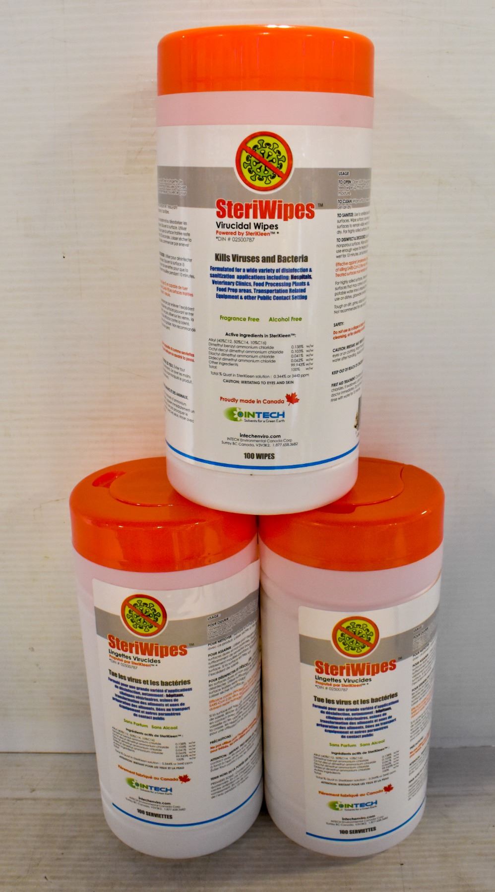 BY STERIKLEEN. CANADIAN MADE, FRAGRANCE AND ALCOHOL FREE, KILLS VIRUSES AND BACTERIA. FORMULATED FOR SANITIZATION APPLICATIONS IN HOSPITALS, VETERINARY CLINICS, FOOD PREPARATION AND MUCH MORE. 100 WIPES PER CONTAINER.