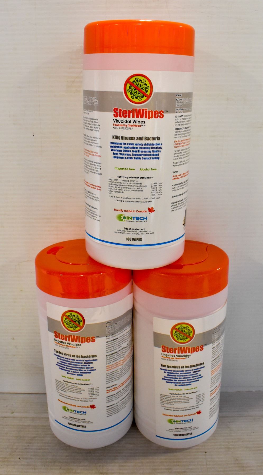 BY STERIKLEEN. CANADIAN MADE, FRAGRANCE AND ALCOHOL FREE, KILLS VIRUSES AND BACTERIA. FORMULATED FOR SANITIZATION APPLICATIONS IN HOSPITALS, VETERINARY CLINICS, FOOD PREPARATION AND MUCH MORE. 100 WIPES PER CONTAINER.