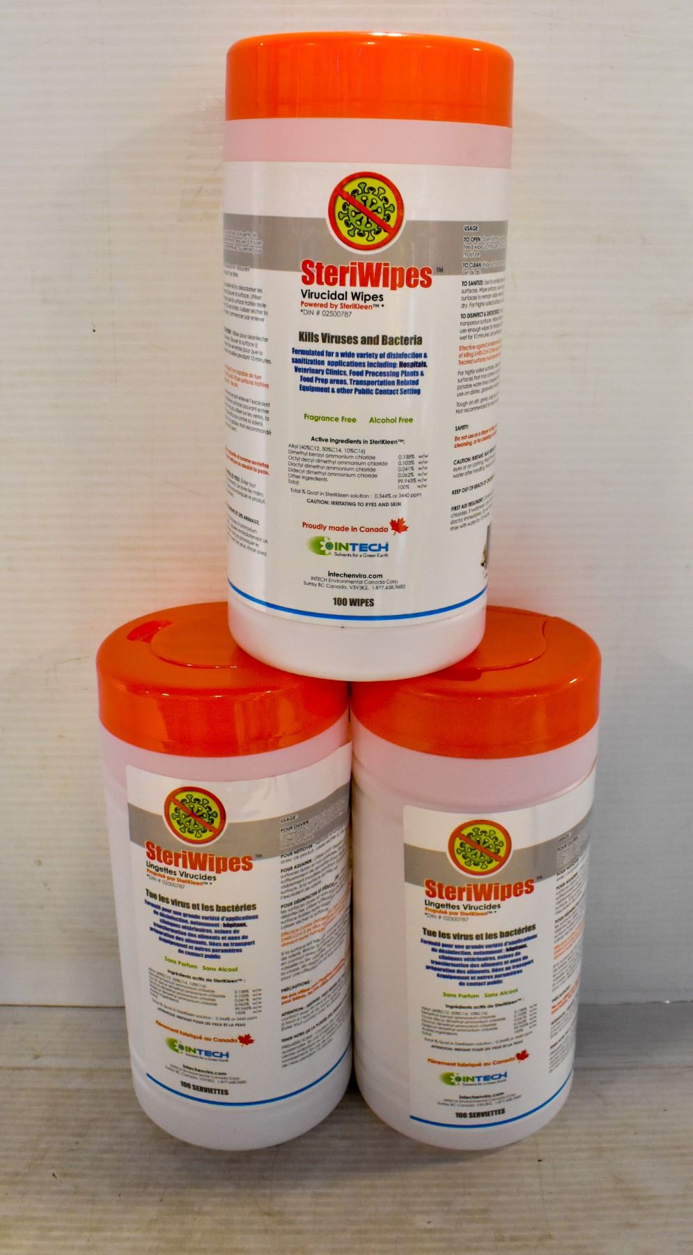 BY STERIKLEEN. CANADIAN MADE, FRAGRANCE AND ALCOHOL FREE, KILLS VIRUSES AND BACTERIA. FORMULATED FOR SANITIZATION APPLICATIONS IN HOSPITALS, VETERINARY CLINICS, FOOD PREPARATION AND MUCH MORE. 100 WIPES PER CONTAINER.