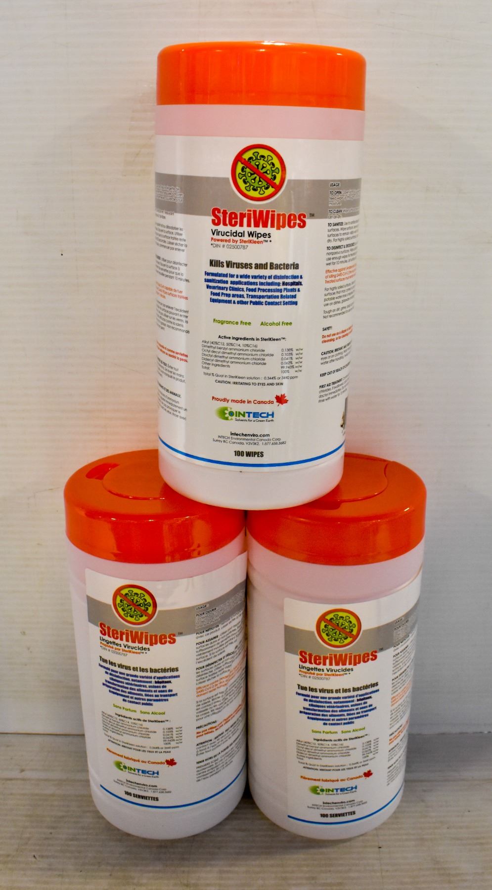 BY STERIKLEEN. CANADIAN MADE, FRAGRANCE AND ALCOHOL FREE, KILLS VIRUSES AND BACTERIA. FORMULATED FOR SANITIZATION APPLICATIONS IN HOSPITALS, VETERINARY CLINICS, FOOD PREPARATION AND MUCH MORE. 100 WIPES PER CONTAINER.