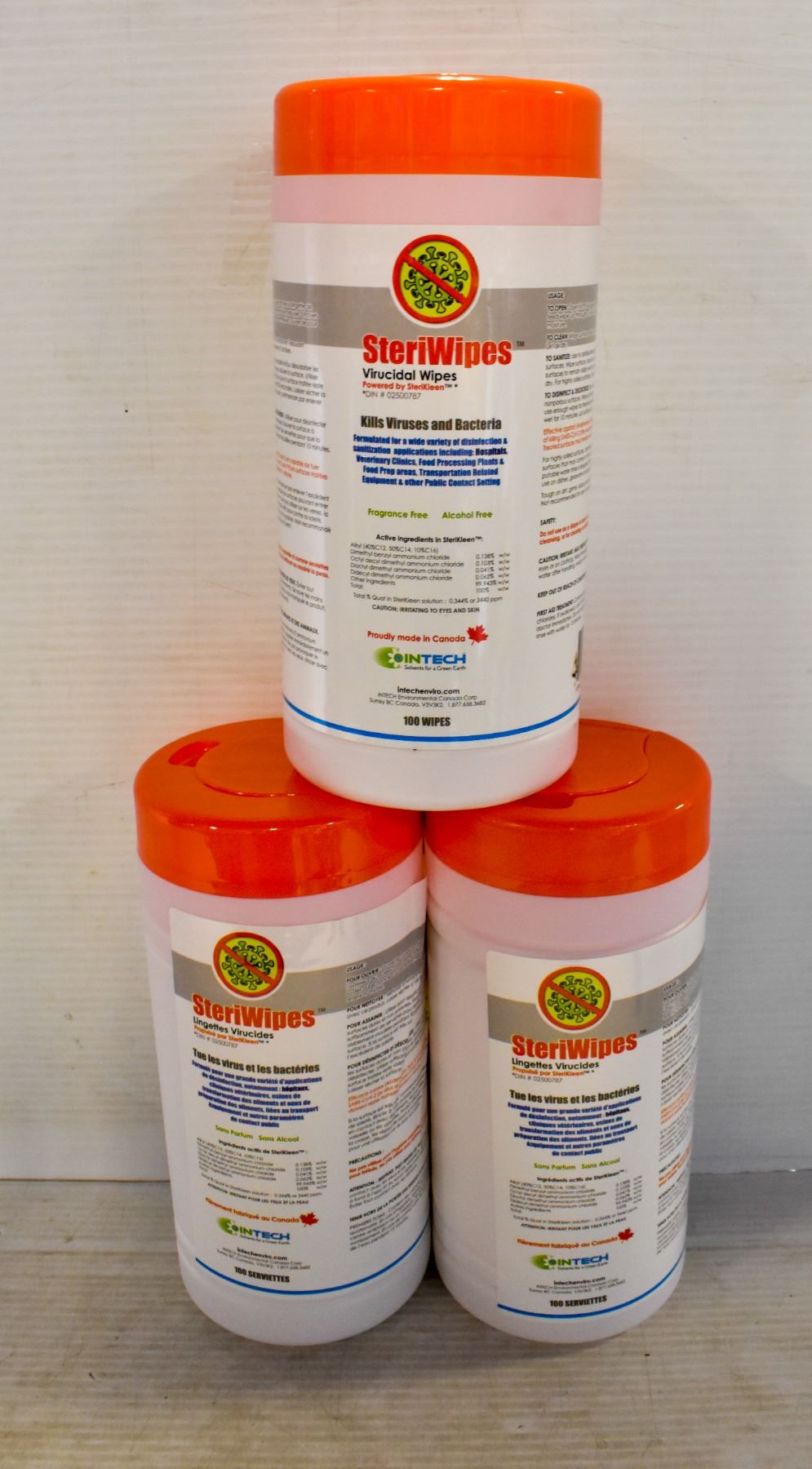 BY STERIKLEEN. CANADIAN MADE, FRAGRANCE AND ALCOHOL FREE, KILLS VIRUSES AND BACTERIA. FORMULATED FOR SANITIZATION APPLICATIONS IN HOSPITALS, VETERINARY CLINICS, FOOD PREPARATION AND MUCH MORE. 100 WIPES PER CONTAINER.