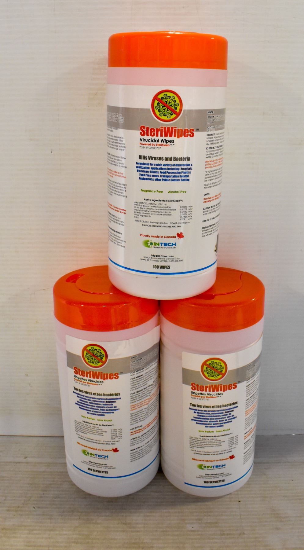 BY STERIKLEEN. CANADIAN MADE, FRAGRANCE AND ALCOHOL FREE, KILLS VIRUSES AND BACTERIA. FORMULATED FOR SANITIZATION APPLICATIONS IN HOSPITALS, VETERINARY CLINICS, FOOD PREPARATION AND MUCH MORE. 100 WIPES PER CONTAINER.