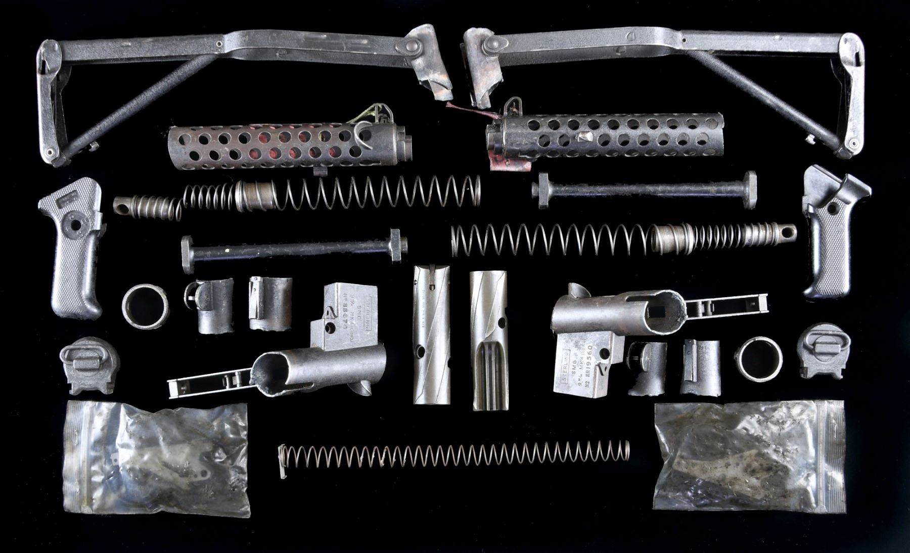 KITS. Lot of 2 Sterling Mk 4 (L2A3) submachine gun parts kits, including: 2 mag. wells, 2 shrouds, 2 folding stocks, 2 bolts, 2 recoil mainsprings, 2 receiver end caps, 2 grips,and other assorted small parts and pieces. CONDITION: good, with areas of wear and scattered superficial marks from handling and storage. PROVENANCE: From the Estate of Ivan Lee Shapiro. (02-23480/MLW). $800-1,200.