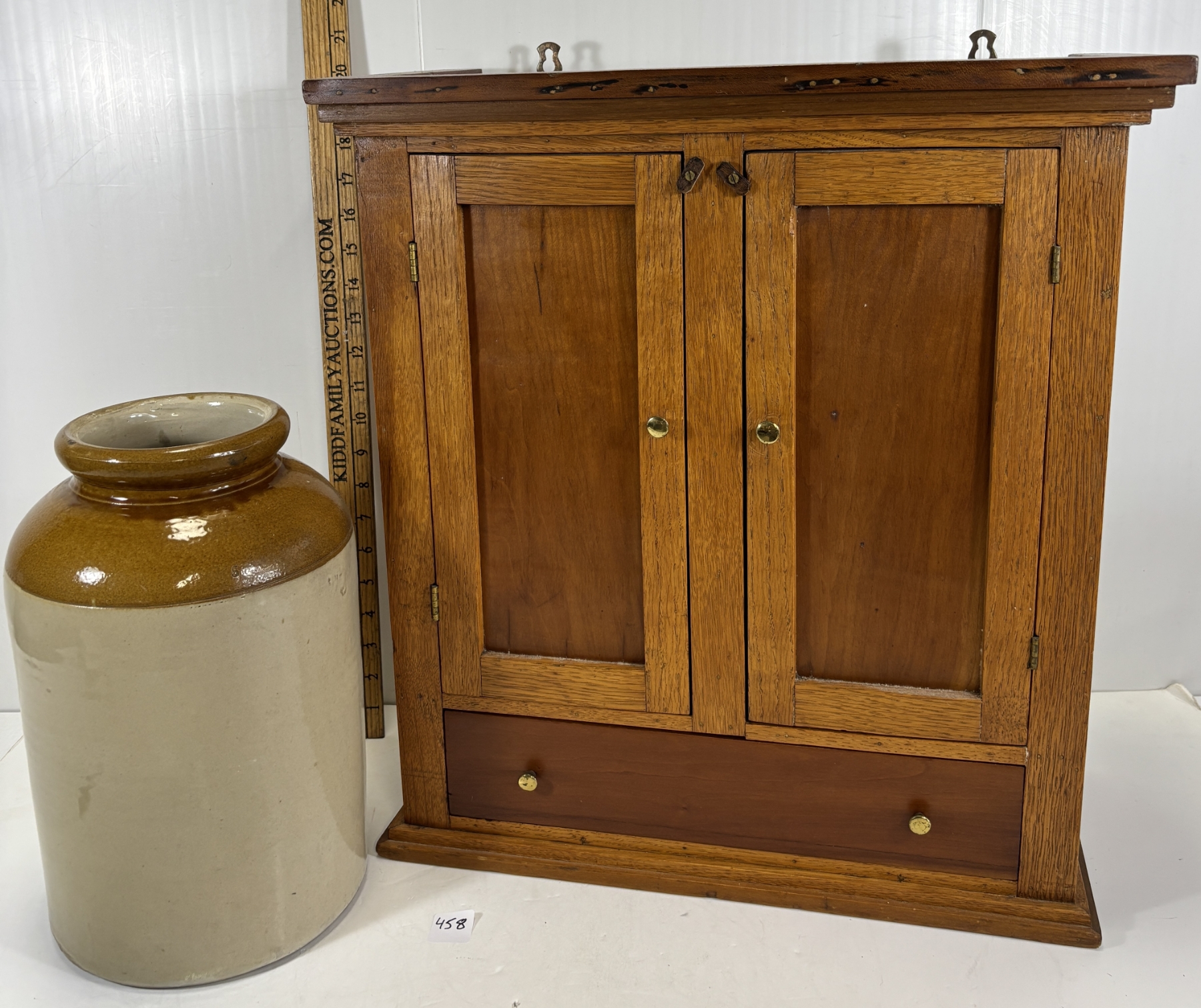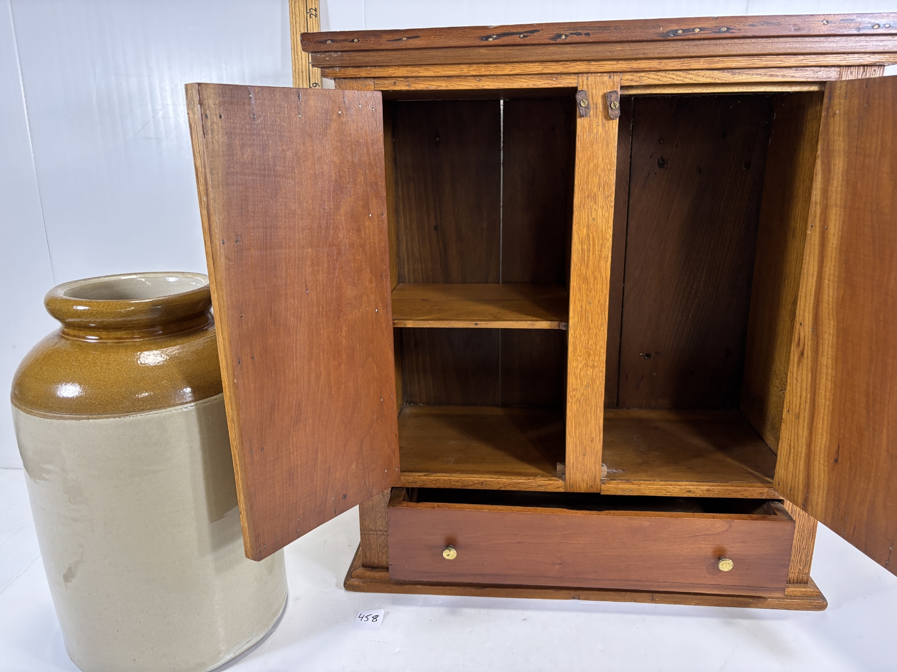 NOTE: NO MAKERS MARK ON CROCK. 18 X 9 X 20 INCH CABINET.