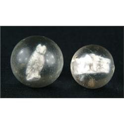 LOT OF 2 SULPHIDE MARBLES. These marbles are a great small size: 1 5/16” owl has few light chips and wear but is in good condition; 1 1/8” cow is grazing and has a few light chips and a bubble around part of the figure. CONDITION: Very good condition. WB 1-4651-28 (200-300)