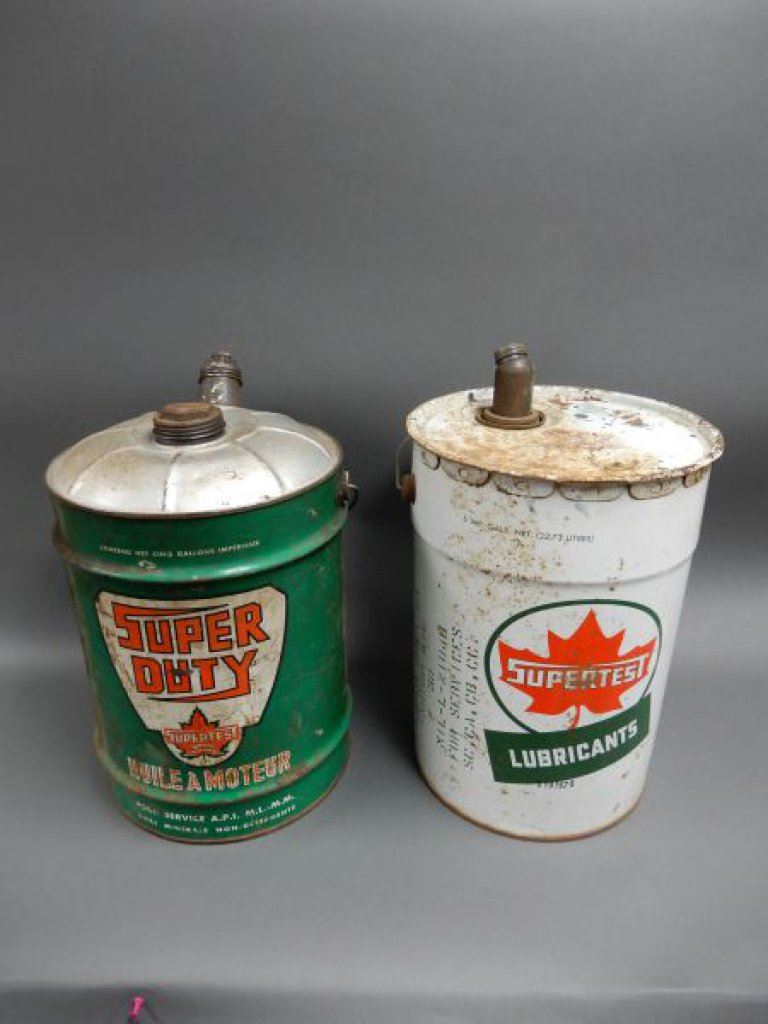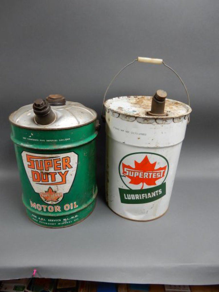 LOT OF 2 SUPERTEST 5 IMP GALLON CANS SUPERDUTY MOTOR OIL - SUPERTEST LUBRICANTS - CORRECT CAPS - SURFACE RUST & DENTING LOCATION: SUPERTEST ROOM