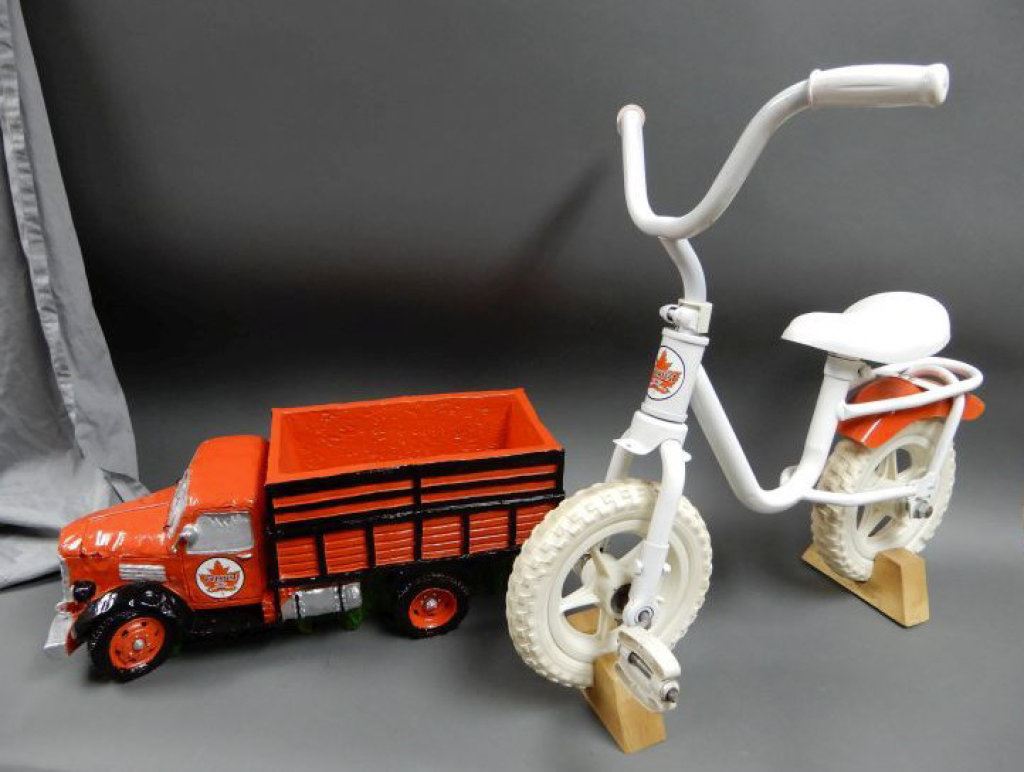LOT OF 2 SUPERTEST COLLECTIBLES CHILDS BIKE REPAINT TO SUPERTEST FLOWER PLANTER TRUCK PAINTED TO SUPERTEST SUPERTEST ROOM LOCATION: SUPERTEST ROOM