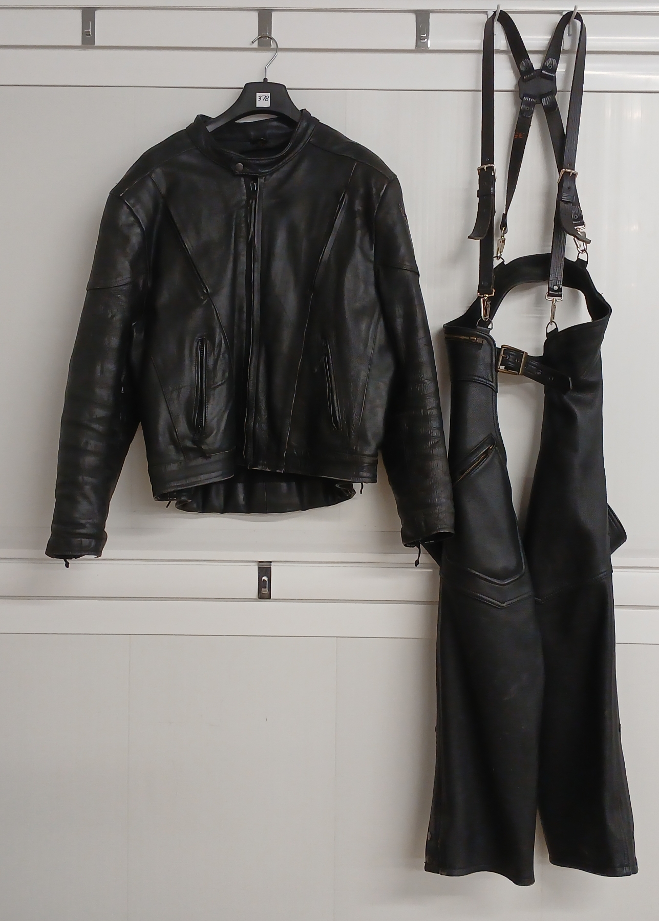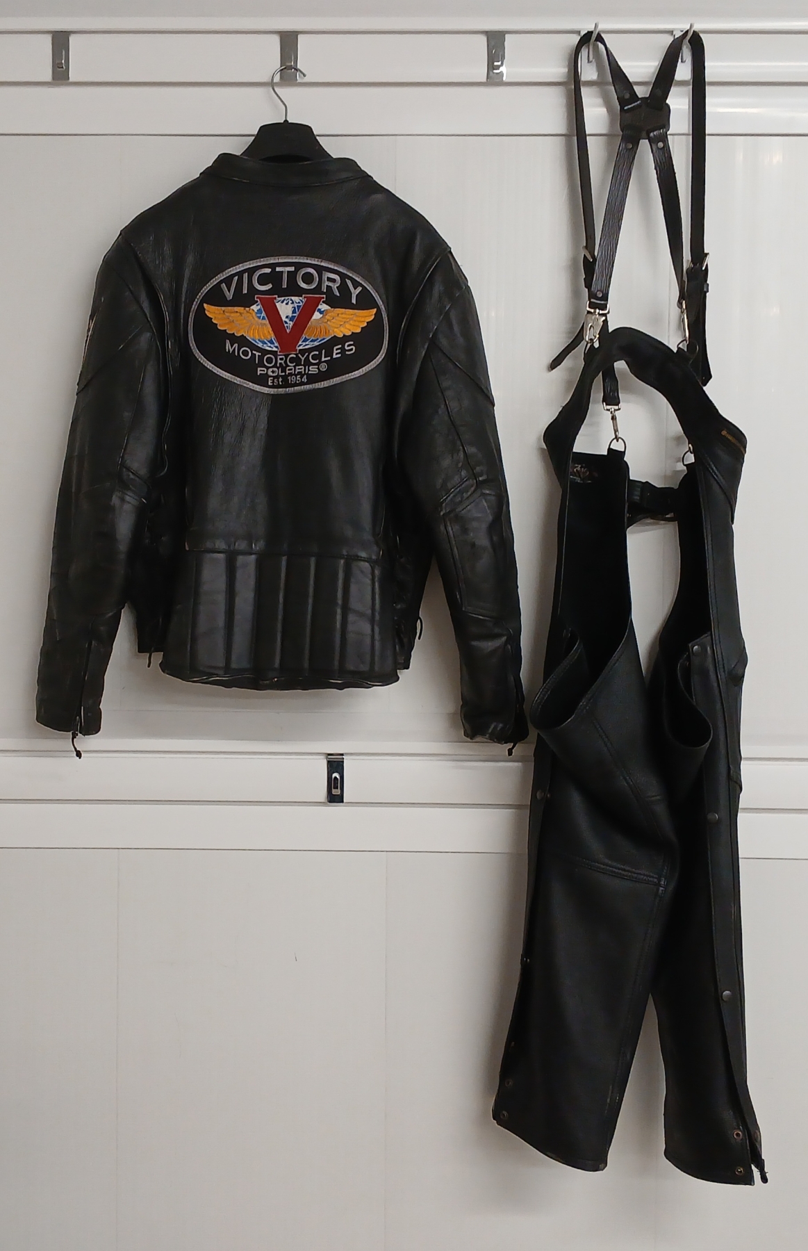 NOTE: JACKET SIZE 50 - JACKET MARKED SCARBOROUGH & VICTORY MOTORCYCLES POLARIS EST. 1954 - CHAPS MARKED TORONTO