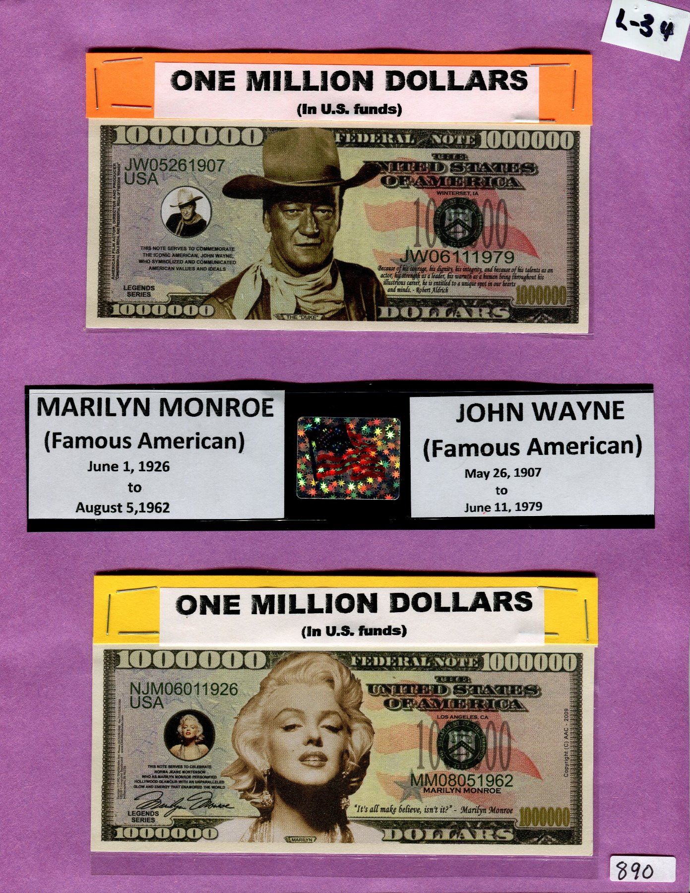 LOT OF 2 TOKEN MILLION DOLLAR BILLS ( JOHN WAYNE, MARILYN MONROE)