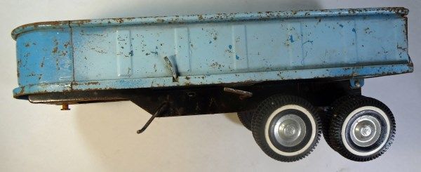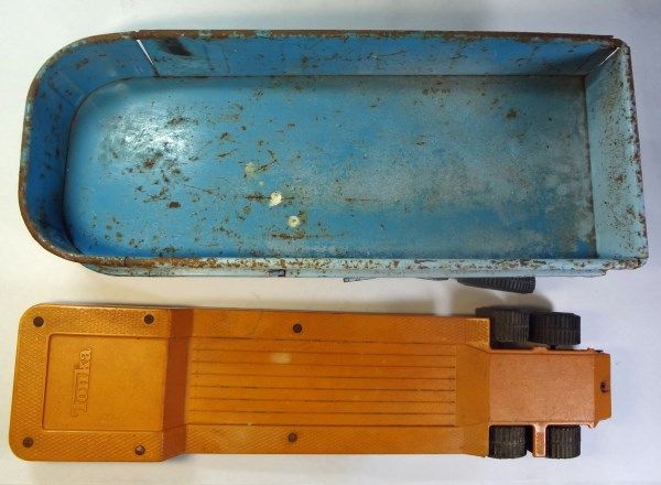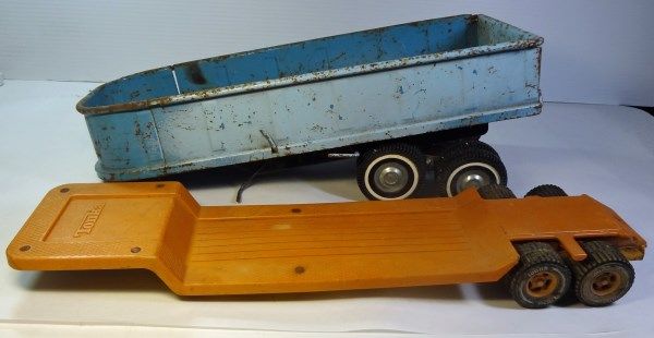 LOT OF 2 TOY TRAILERS. ONE IS A TONKA FLAT BED AND THE OTHER IS A STEEL CARGO TRAILER