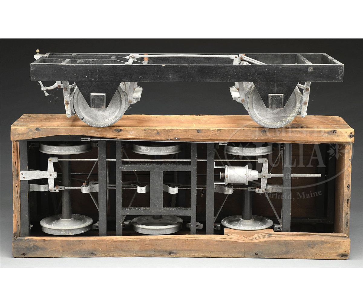 Two large scale sample wood and zinc train car undercarriages in their original wooden crates perhaps to show new developments in brake mechanisms. These models do not appear to have been removed from the crates in quite some time. SIZE: 36" l x 14" w, 6-1/2" wheel dia. CONDITION: Both appear to be structurally sound, wheels show overall oxidation. 1-13580