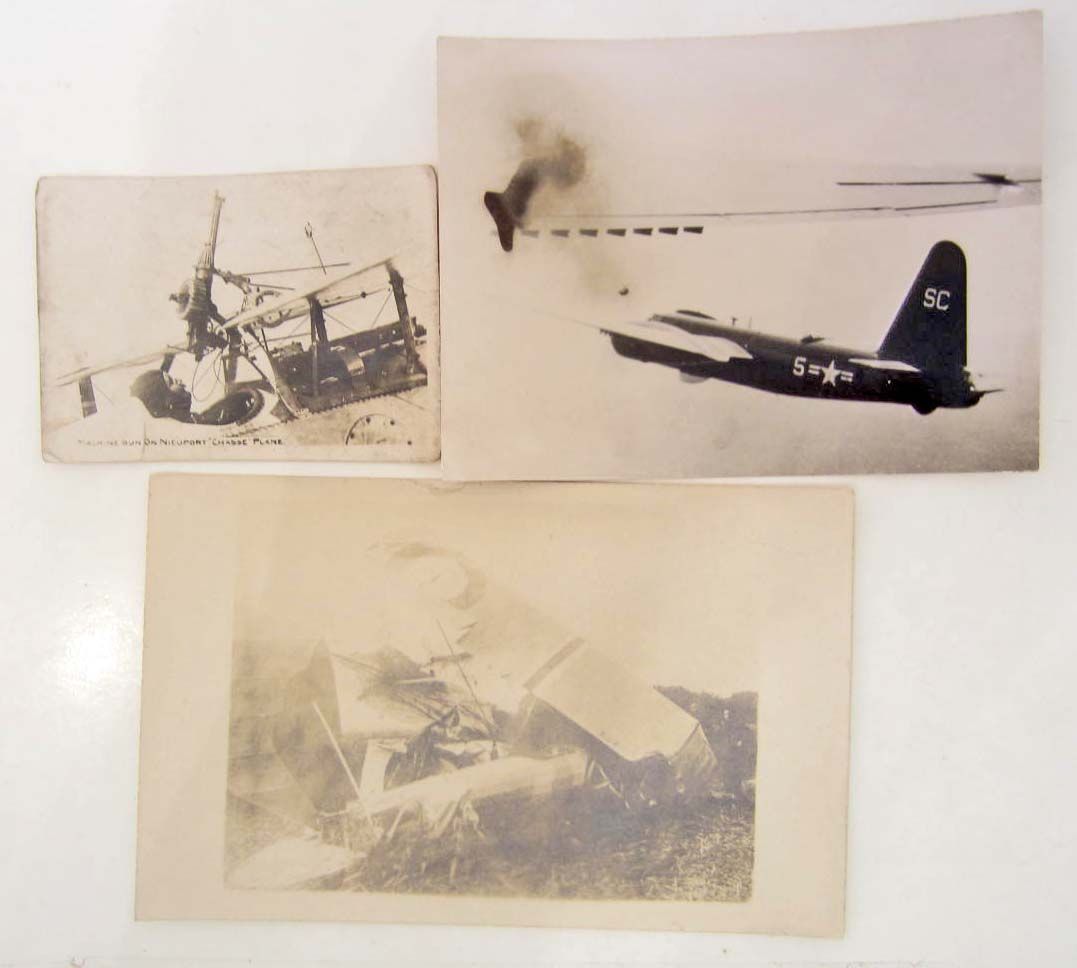 1 is a RPPS Real Photo Postcard of a Wrecked Plane (British TSF), 1 is a Military Plane taken from inside another Plane & 1 is Machine gun on Neiuport Chasse Plan