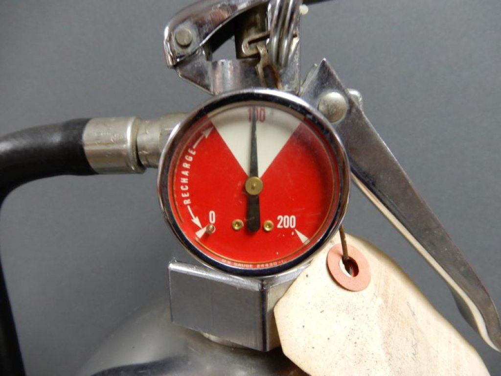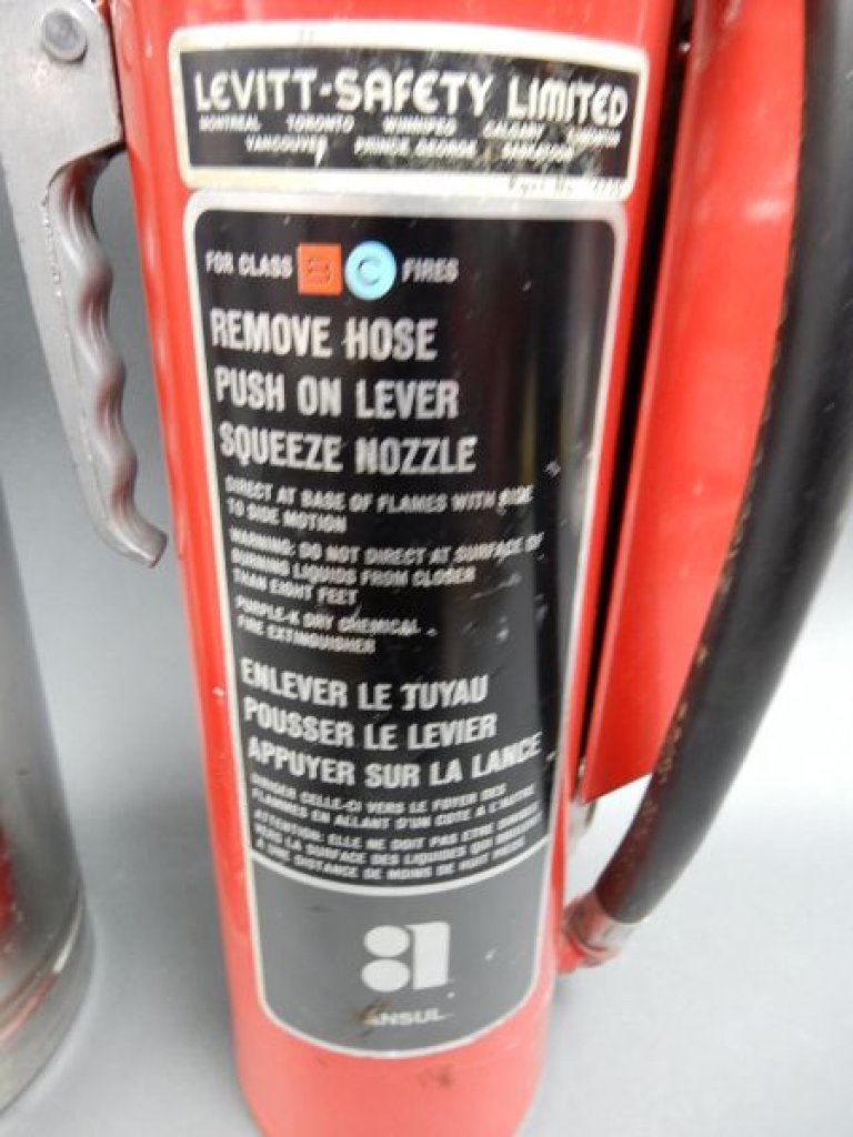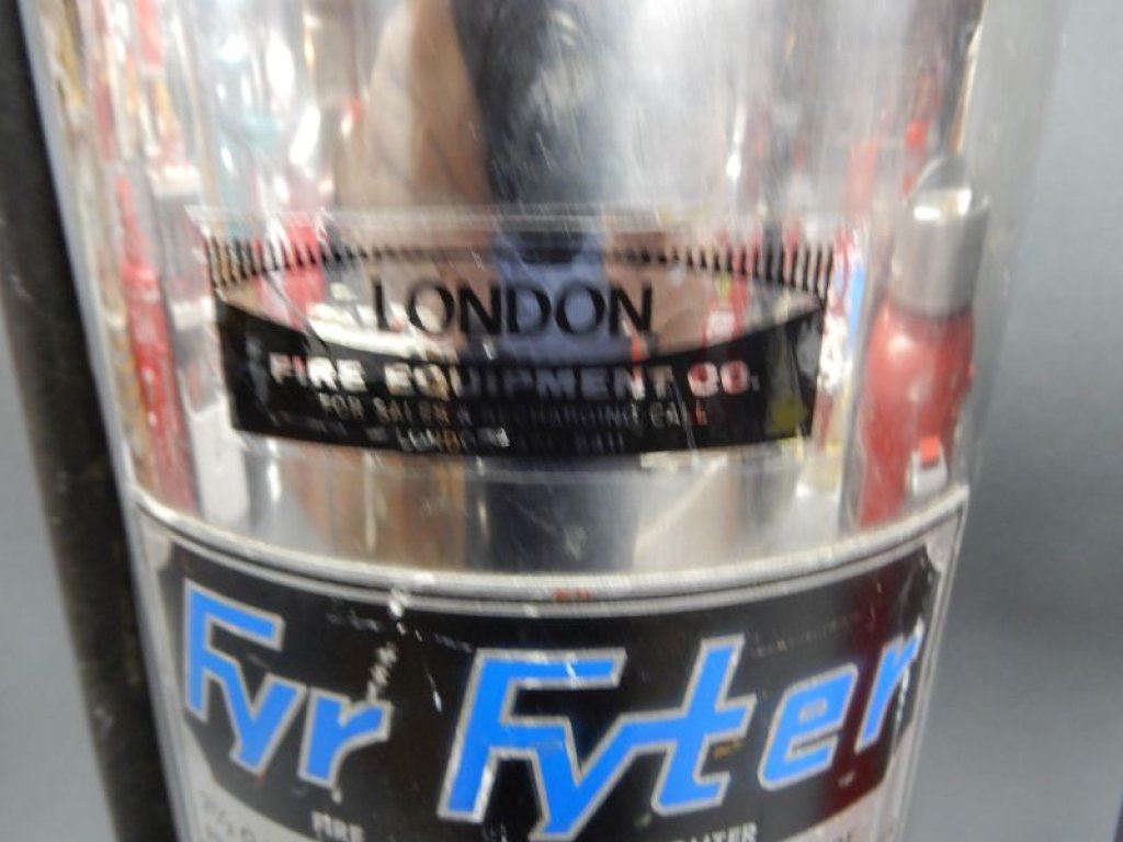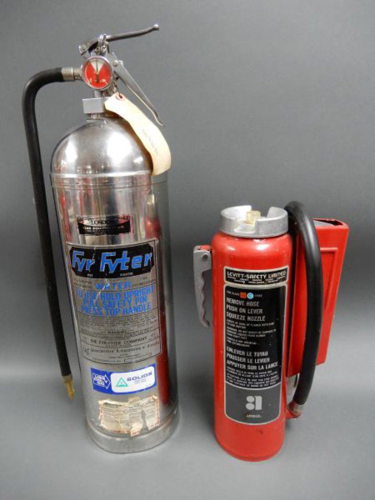 LOT OF 2 VINTAGE FIRES EXTINGUISHERS CHROME FYR FYTER 2 1/2 GAL. - UNDERWRITERS LABORATORIES OF CANADA- LEVITT- SAFETY LTD.- BILINGUAL- METAL LOCATION: LOWER RIGHT