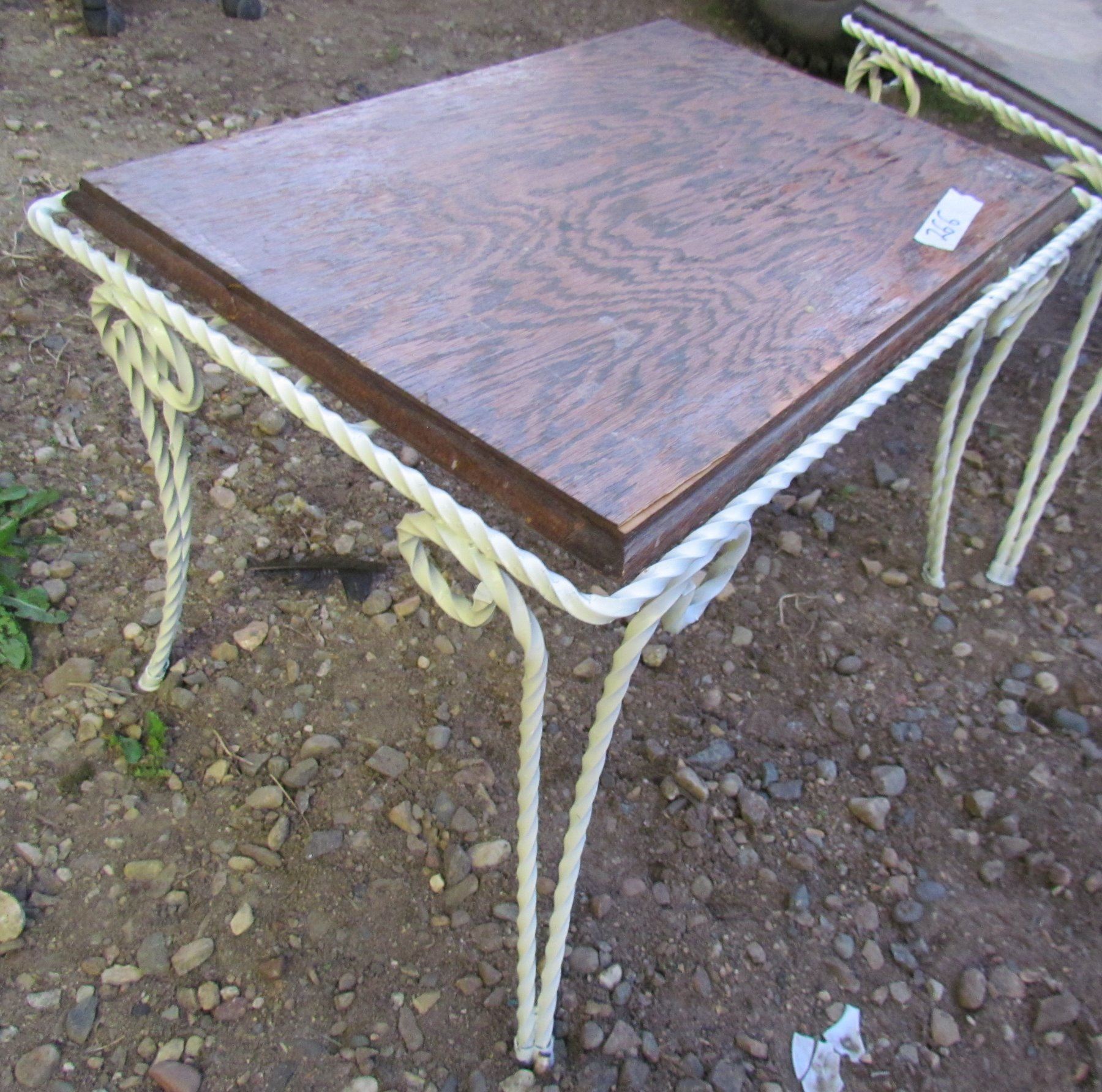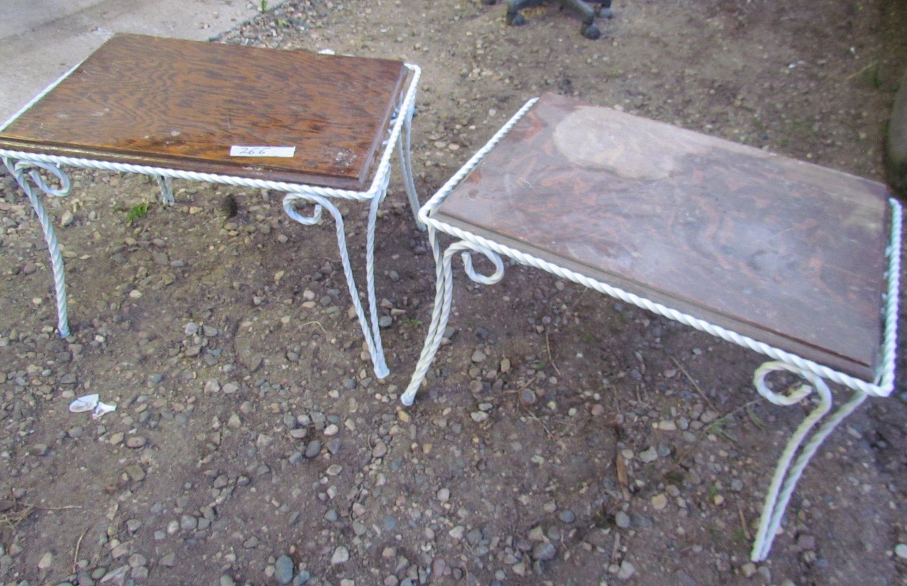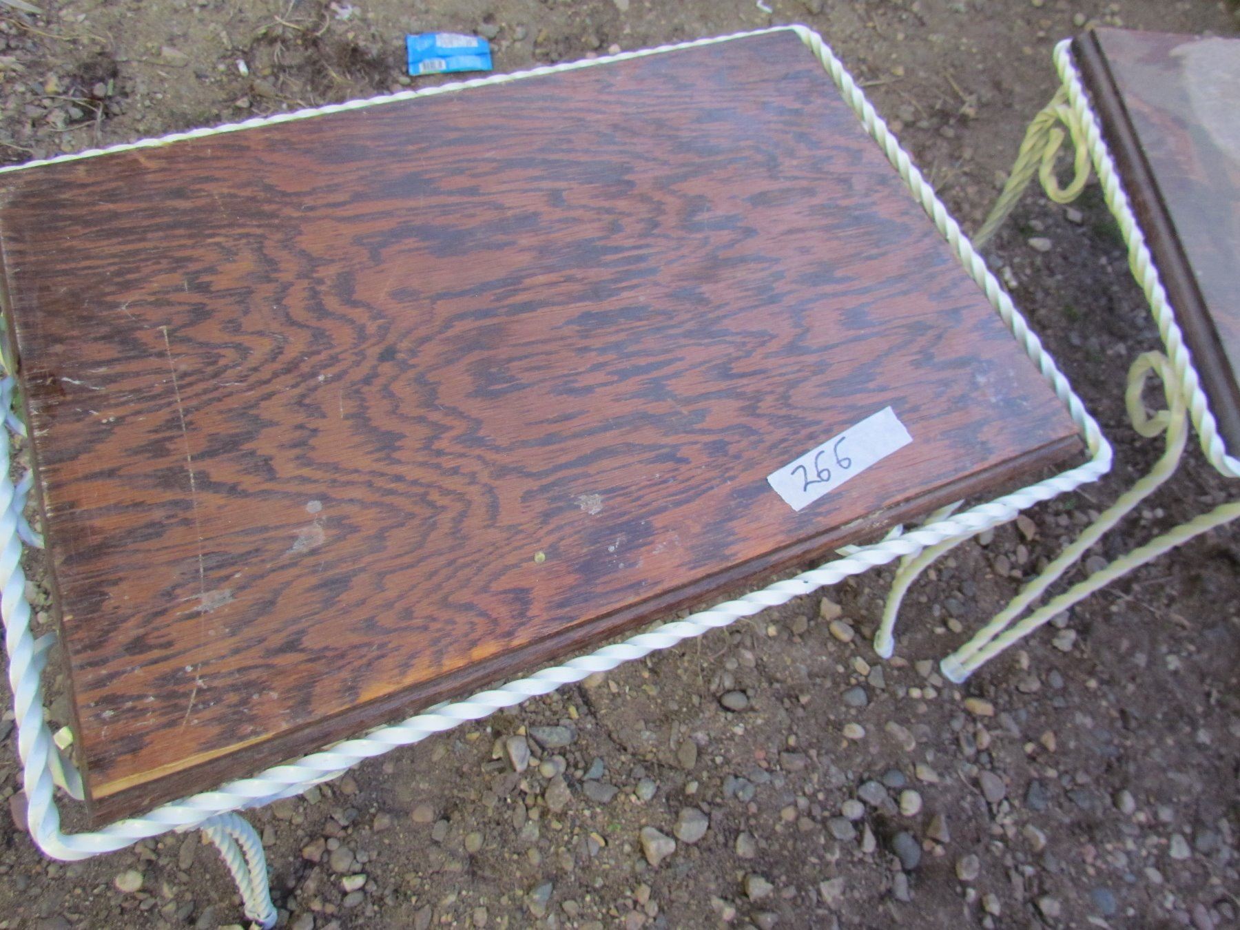 LOT OF 2 WROUGHT IRON TABLES (OAK TOPS) *23" X 16" X 15"HIGH*