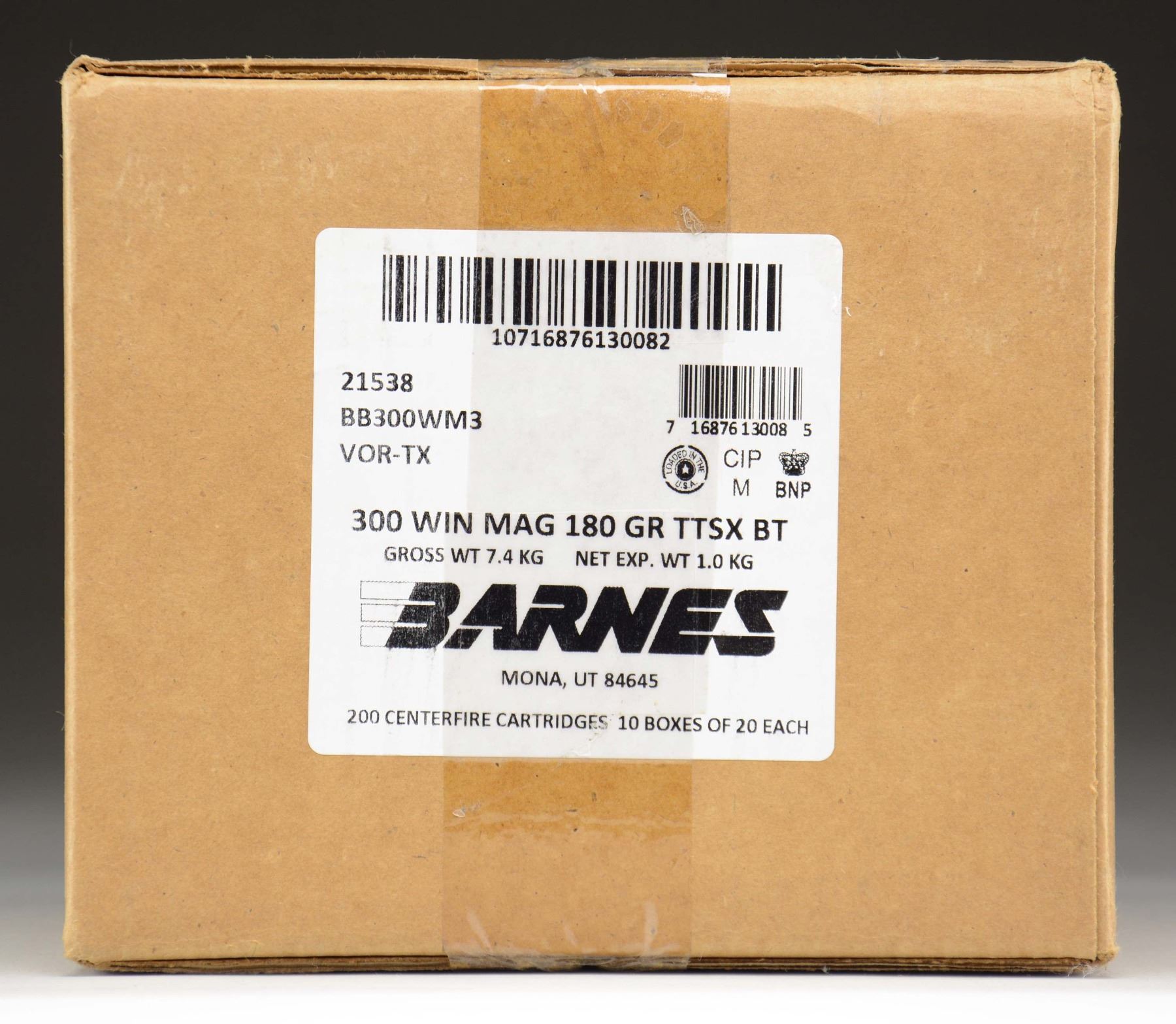 This lot consists of ten 20 rd. boxes of Barnes Vor-Tx 180 gr. TTSX BT ammo. CONDITION: near excellent overall in factory boxes. PROVENANCE: The Collection of Gun Sport Ltd owned by Jon R. Thomas. (02-20249/MJC). $300-500 for lot.