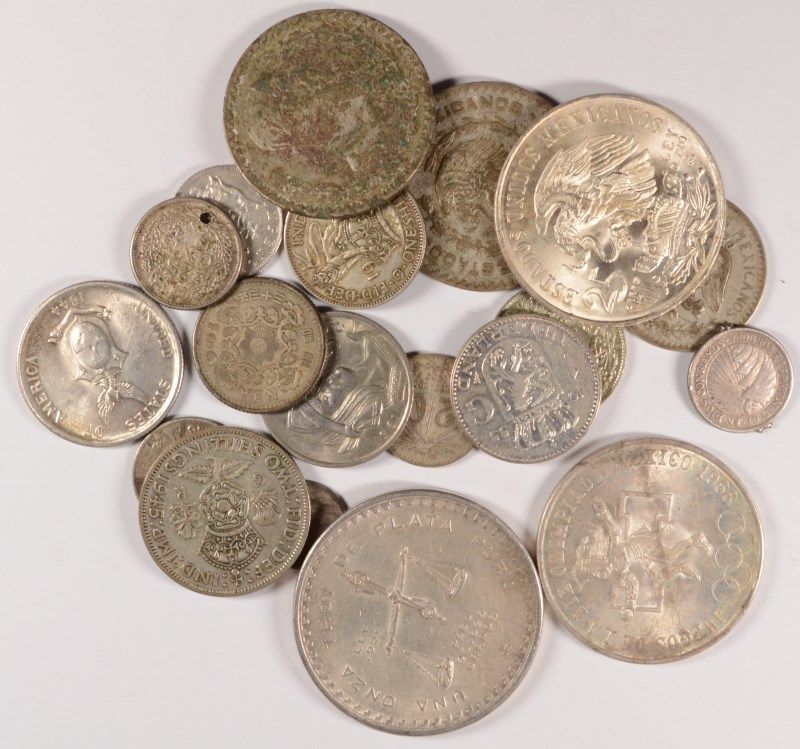 LOT OF ( 21 ) FOREIGN SILVER COINS, MANY LARGER COINS
