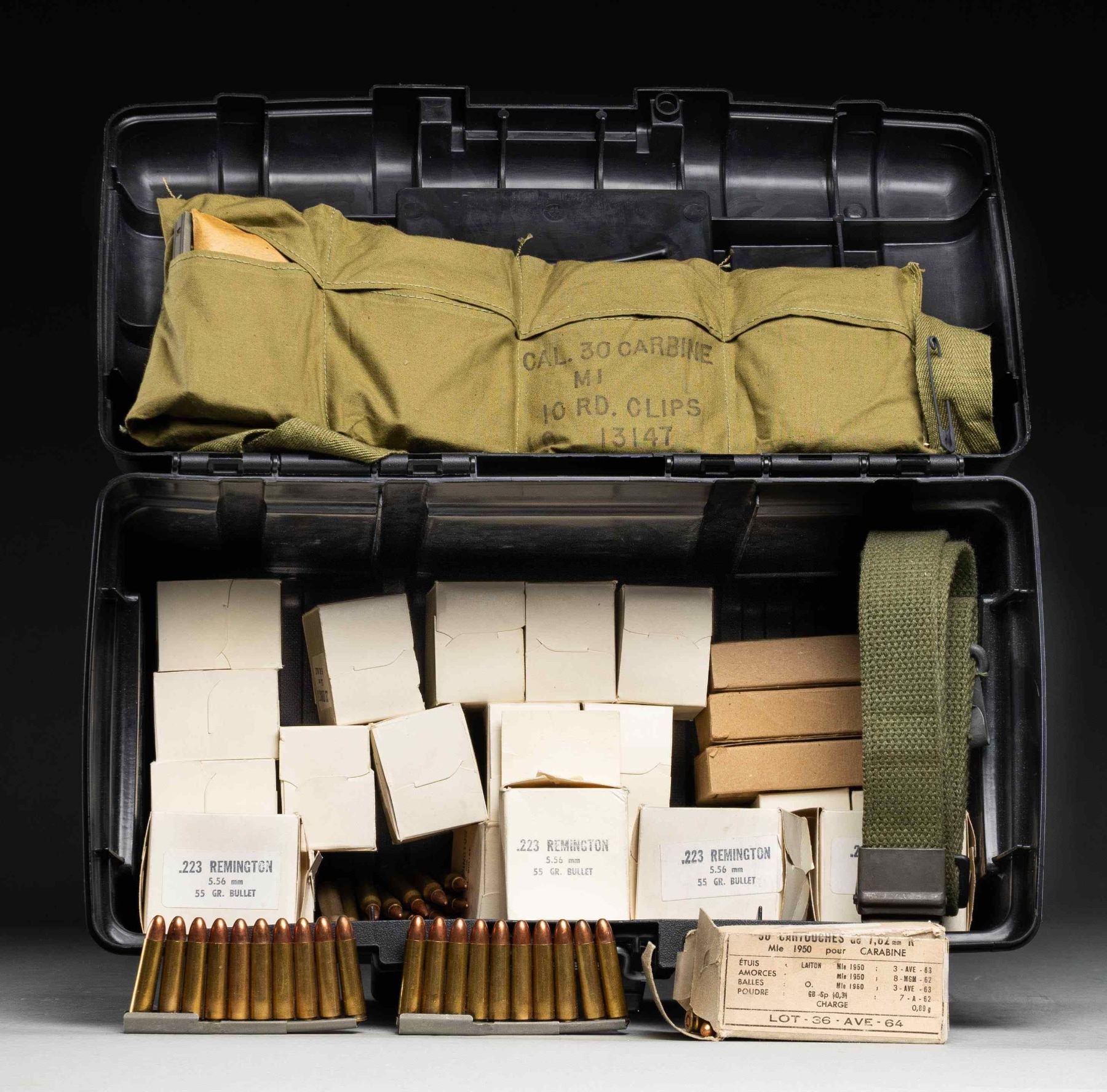 1) 60 rds. of Korean made 223 Rem. head stamped "PS" with 1970's dates. 2) About 400 rds. of 70's dated Lake City 223 Rem 55 gr. FMJ in white boxes. 3) About 140 rds. of mixed 30 Carbine including 1950's LC headstamp on stripper clips & French made with "VE" headstamps & 1950's dates. The latter ammo is likely corrosive. CONDITION: ammo is generally very good with some rds. exhibiting tarnish & oxidation. (02-24542-15/MJC). AMMO. $200-300 for lot.