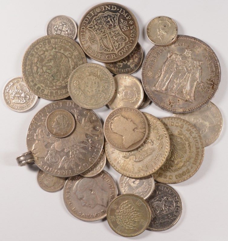 LOT OF ( 23 ) FOREIGN SILVER COINS , MANY LARGE COINS INCLUDED