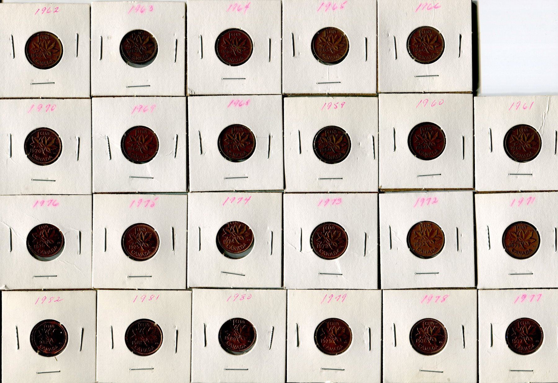 LOT OF 23 -ONE CENT COINS (CANADA) *DATES 1959 TO 1982* (MISSING 1967)