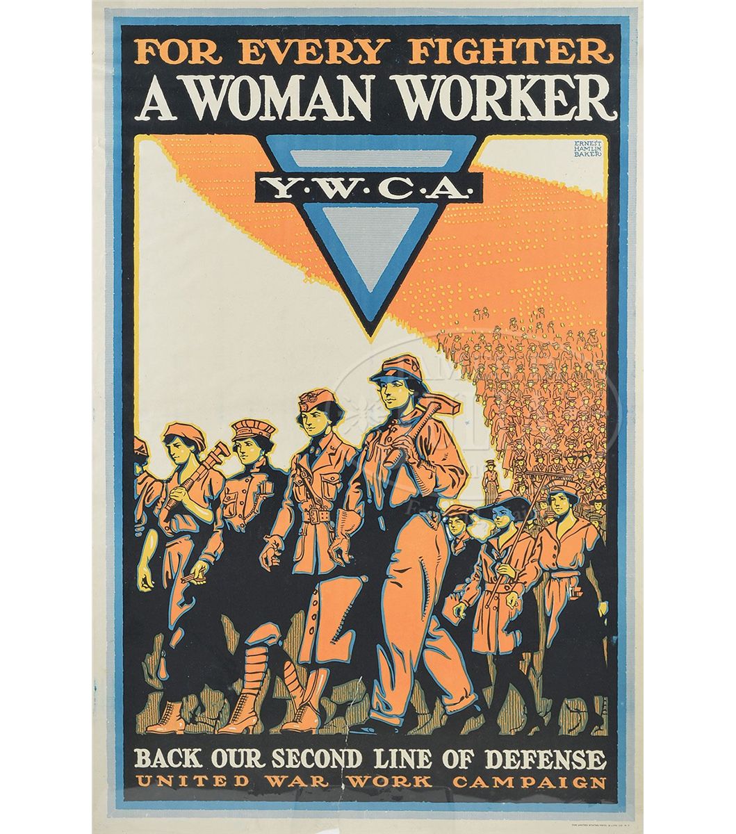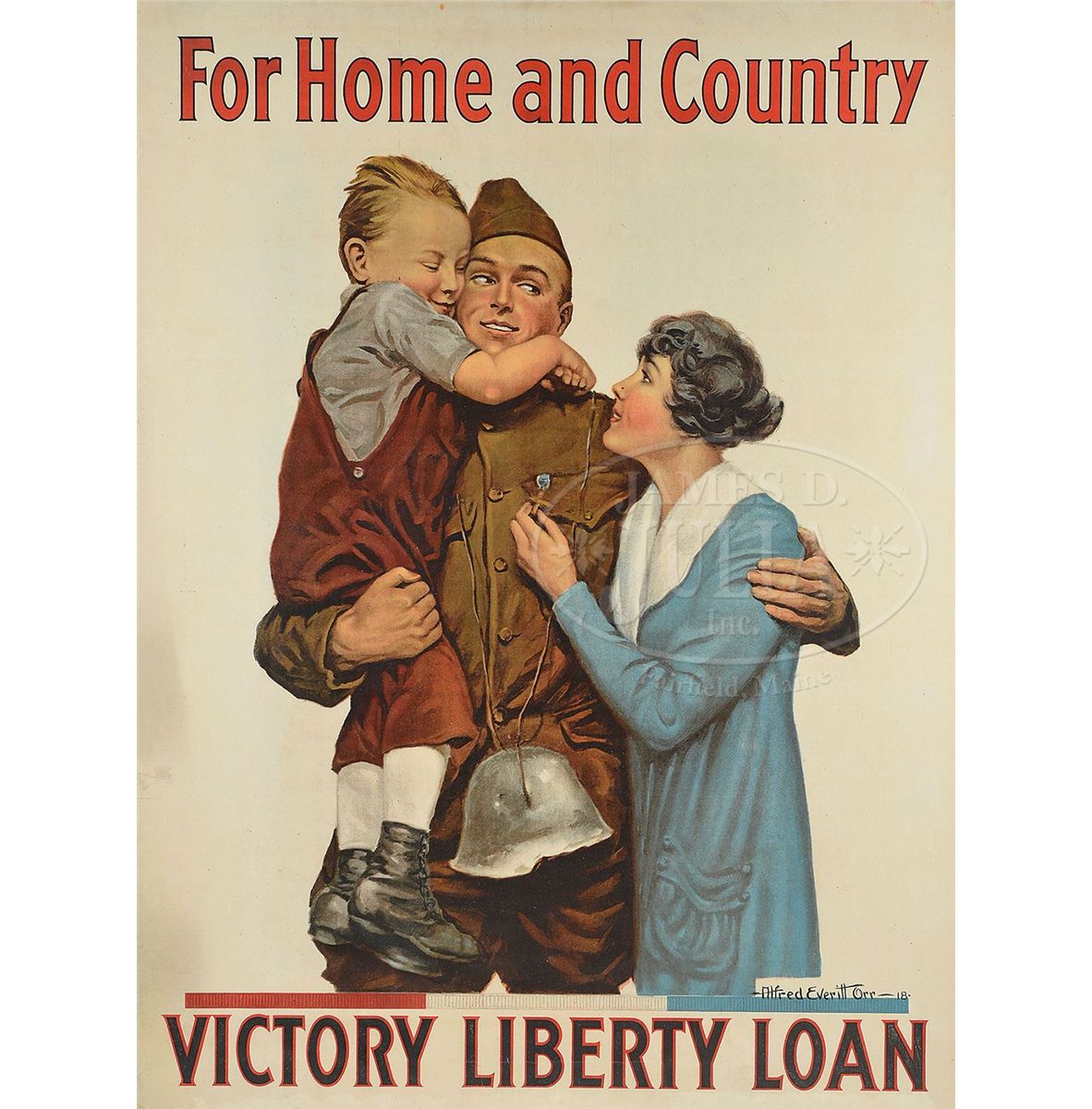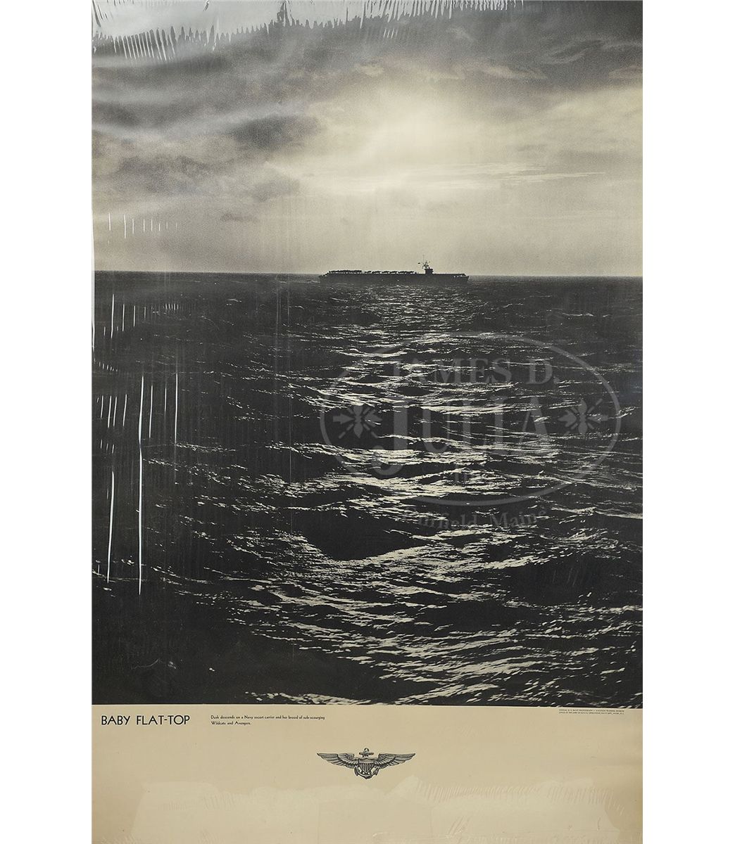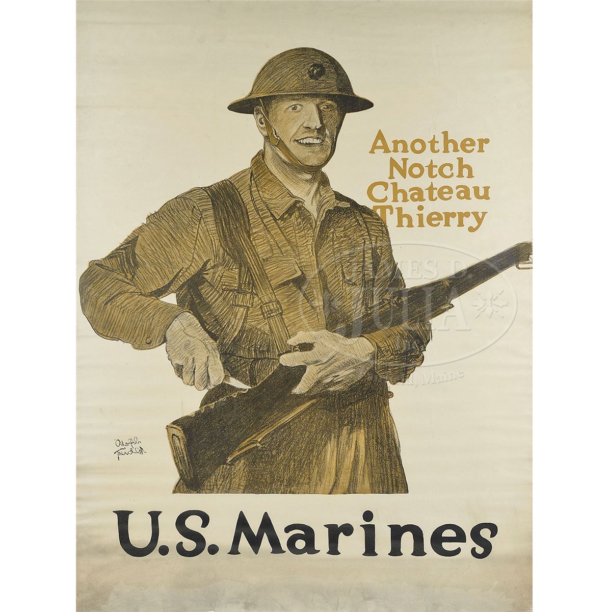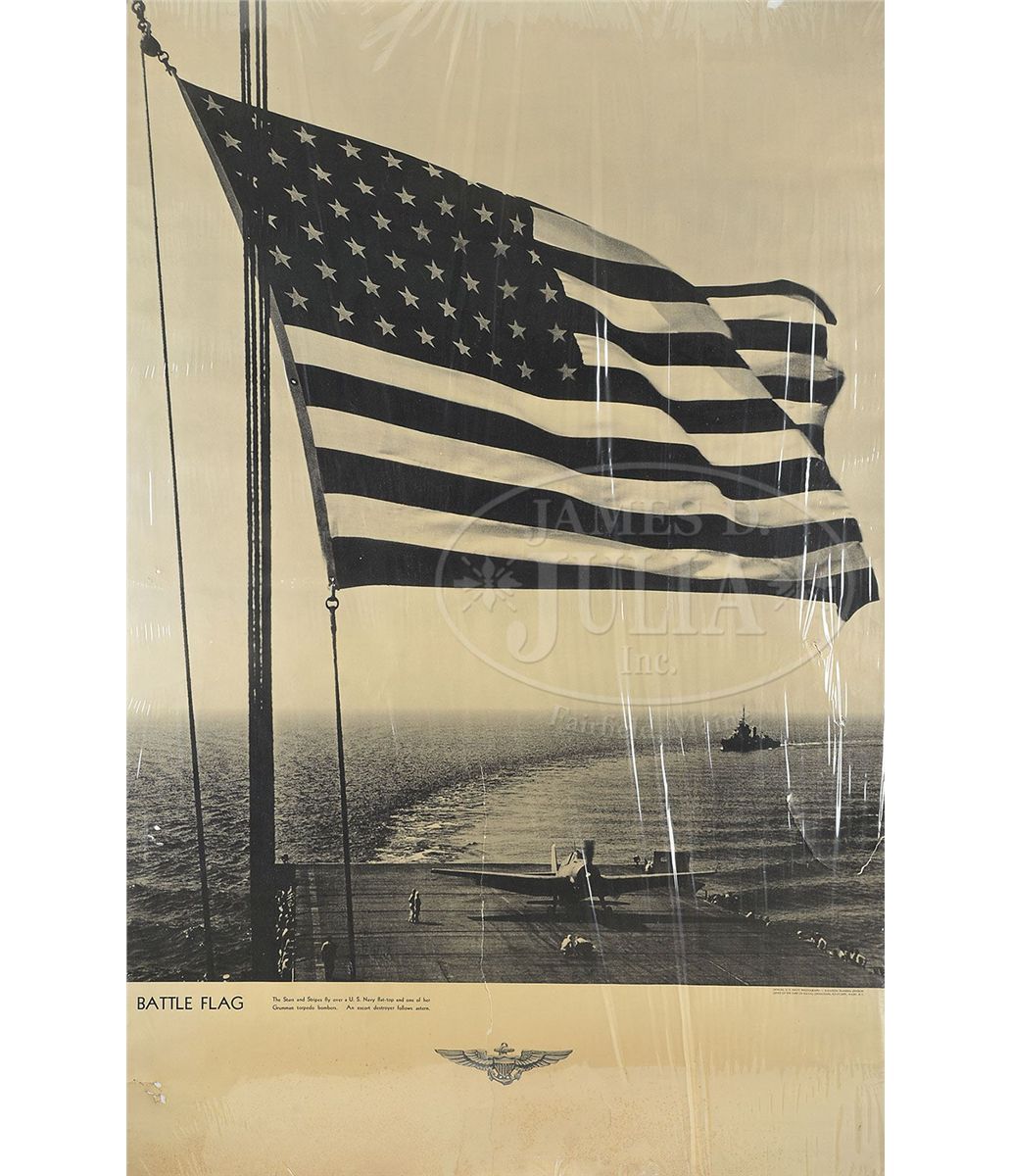 1) WWI "Victory Liberty Loan" poster by artist Clyde Forsythe of soldier carrying three German helmets; 2) WWI poster by artist James Daugherty captioned "The Ships Are Coming"; 3) WWI poster captioned "E-E-E-YAH-YIP/GO OVER WITH U.S.MARINES"; 4) WWI U.S. Marines poster captioned "Another Notch Chateau Thierry"; 5) WWI U.S. Marine poster by artist Clarence F. Underwood captioned "Be A Sea Soldier"; 6) WWI Y.W.C.A. poster by artist Ernest Hamlin Baker captioned "For Every Fighter, A Woman Worker"; 7) WWI United States Shipping Board poster captioned "On The Job For Victory"; 8) WWI Victory Liberty Loan poster by artist Gerrit A. Beneker captioned "Sure! We'll Finish The Job"; 9) WWI Third Liberty Loan poster by artist Howard Chandler Christy, 1917, captioned "Fight Or Buy Bonds"; 10 & 11) Two WWI Victory Liberty Loan posters by artist Alfred Everitt Orr 1918, captioned "For Home and Country"; 12) WWI Red Cross poster by artist A. E. Foringer captioned "The Greatest Mother in the World"; 13) WWI Third Liberty Loan poster captioned "Over The Top For You"; 14) WWI United States Shipping Board poster by artist James H. Daugherty captioned "The Ships Are Coming"; 15) WWI United States Food Administration poster by artist J. E. Sheridan captioned "Food Is Ammunition - Don't Waste it"; 16) WWI U.S. Marines poster by artist John A. Coughlin captioned "Go Over The Top With"; 17) WWI Philadelphia Civilian Service and Labor Dept. Uncle Sam poster captioned "Honor Roll of Women Who Will Work to Win the War"; 18) WWI Victory Liberty Loan poster by artist L. A. Shafer captioned "They Kept The Sea Lanes Open"; 19) WWI United States Shipping Board poster captioned "Two Inspiring Cablegrams"; 20) WWI United War Work Campaign poster, 1918, with the Y.W.C.A. logo; 21) WWII U.S. Navy Aviation Training poster "Battle Flag". Official U.S. Navy photograph of a carrier and one of her Grumman torpedo bombers; 22) WWII U.S. Navy Aviation Training poster "Baby Flat-Top". Official U.S. Navy photograph of an escort carrier and her squadron of Wildcat and Avenger aircraft"; 23) U.S. Navy Aviation Training poster "Wake of PBY" and "Noah's Ark". Official U.S. Navy photograph depicts a Consolidated Catalina and a Coronado. SIZE: 1) 20" w x 30" t; 2) 19" w x 25" t; 3) 21" w x 28" t; 4) 30" w x 40" t; 5) 30" w x 40" t; 6) 28" w x 41-1/2" t; 7) 38-1/2" w x 30" t; 8) 26" w x 37" t; 9) 30" w x 40" t; 10 & 11) 30" w x 40" t; 12) 28" w x 42" t; 13) 20" w x 30" t; 14) 20" w x 30" t; 15) 21" w x 29-1/2" t; 16) 20" w x 28" t; 17) 22" w x 28" t; 18) 39" w x 29" t; 19) 32" w x 43-1/4" t; 20) 32" w x 36" t; 21) 39" w x 60-1/2" t; 22) 39"w x 60-1/2" t; 23) 39" w x 60" t. CONDITION: 1) Near excellent; 2) Good - very good with couple margin tears and soiling across the bottom; 3) Fair - good; has vertical 10" tear at 12 o'clock; 4) Good - very good; soiling and margin tears across bottom; 5) Image area good - very good; some paper loss and soiling to white margin; 6) Has an 8" vertical tear at 6 o'clock otherwise very good; 7) Near excellent; 8) Image area near excellent; some wear and paper loss to white margin; 9) Strong horizontal fold otherwise very good; 10 & 11) Both have a few horizontal folds otherwise very good; 12) Very good with a band of soiling across the bottom; 13) Very good - excellent; 14) Good - very good with wrinkle in bottom right corner; 15) Short margin tear at 12 o'clock otherwise very good - excellent. 16) Has a few margin tears that extend into the image, otherwise good; 17) Good - very good; 18)Good to very good; soiling to right side; margin tears across the top some extending into the image; 19) Very good; 20) Has many fine wrinkles to the field and heavy wrinkling to the margins otherwise good; 21) Fair; 21" vertical tear at six o'clock; several other margin tears; 22) Very good; 23) Very good. 7-70452