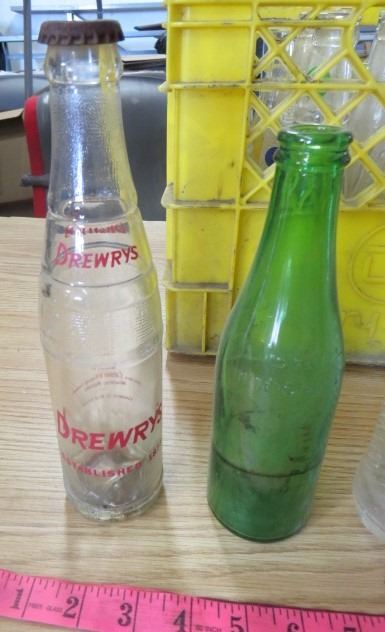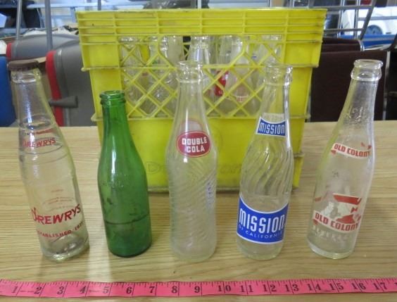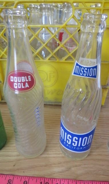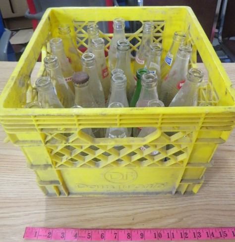 LOT OF 24 POP BOTTLES WITH YELLOW PLASTIC CRATE (VARIOUS BRANDS)