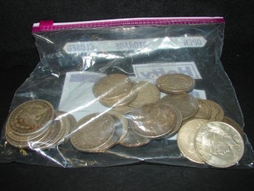 LOT OF 25 U.S. MORGAN & PEACE DOLLARS. Morgans include (1) 1879-O, (1) 1883, (1) 1884-O, (1) 1886, (1) 1888, (2) 1889 (one with hole), (1) 1890-O, (1) 1896, (2) 1900-O, (1) 1921-D, (1) 1921-S, (3) 1921. Peaces include (1) 1922-S, (4) 1923, (1) 1924, (1)