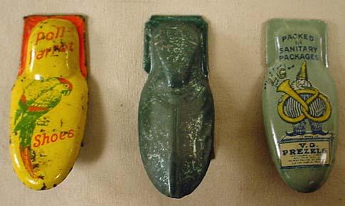 LOT OF 3 1920'S CRICKET ADVERTISING NOISE MAKERS - Incl. Poll Parrot Shoes, VG Prezels and a premium.