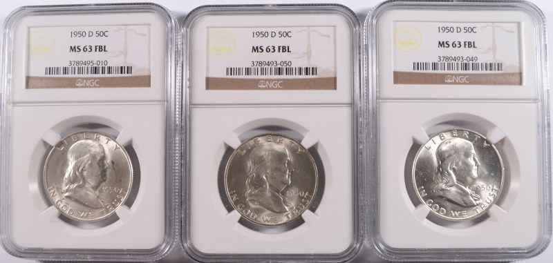 LOT OF ( 3 ) 1950-D FRANKLIN HALF DOLLAR, NGC MS-63 FBL
