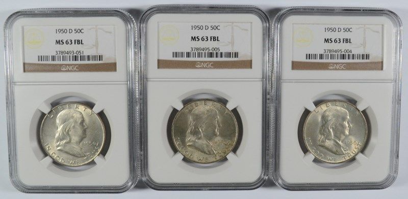 LOT OF ( 3 ) 1950-D FRANKLIN HALF DOLLARS, NGC MS-63 FBL