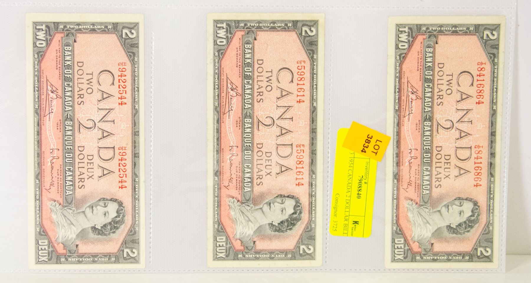 LOT OF 3 1954 CANADA 2 DOLLAR BILLS
