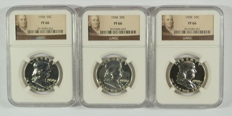 LOT OF ( 3 ) 1958 FRANKLIN HALF DOLLARS, NGC PROOF-66
