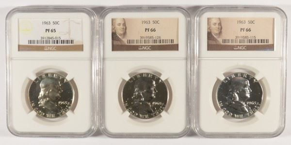 LOT OF ( 3 ) 1963 FRANKLIN HALF DOLLARS, (1) NGC PROOF-65 & (2) NGC PROOF-66