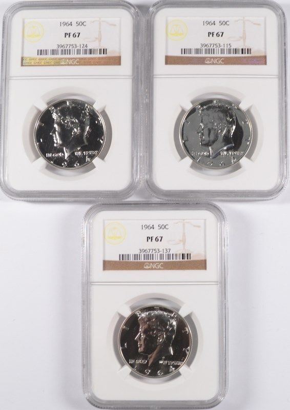 LOT OF ( 3 ) 1964 KENNEDY HALF DOLLARS, NGC PROOF-67