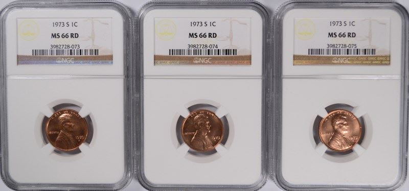 LOT OF (3) 1973-S LINCOLN CENTS, NGC MS-66 RD RARE! NGC PRICE GUIDE=$325.00 EACH