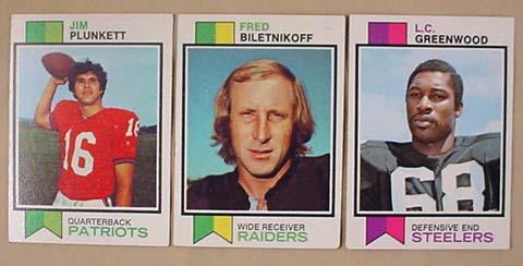 LOT OF 3 1973 TOPPS FOOTBALL CARDS - L.C. Greenwood, Fred Biletnikoff and Jim Plunkett