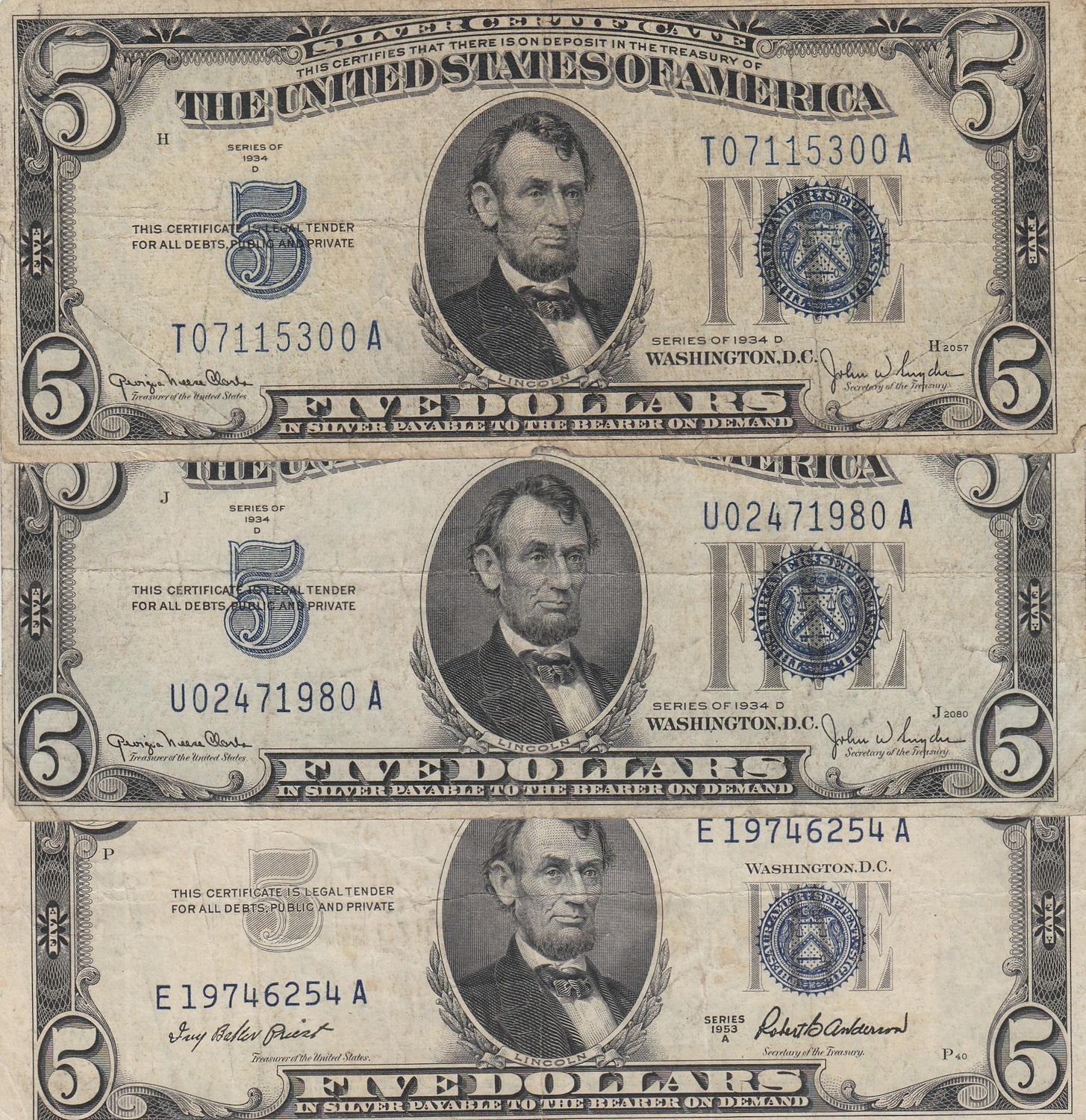 LOT OF 3 $5 SILVER CERTIFICATE 1934 & 1953