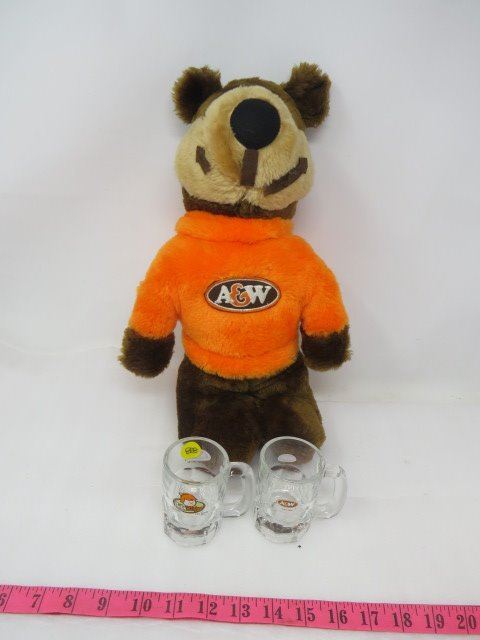 LOT OF 3 A & W RESTAURANT ITEMS (2 X SMALL MUGS, ONE STUFFED BEAR)