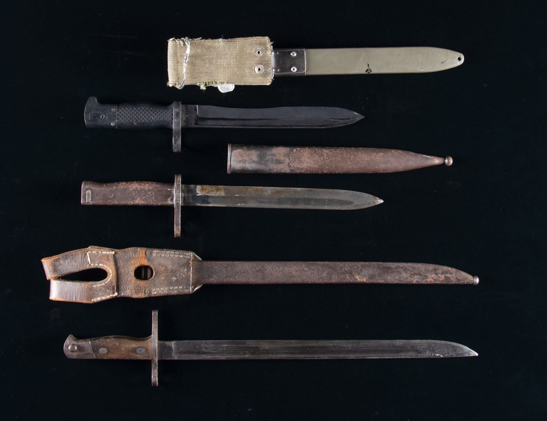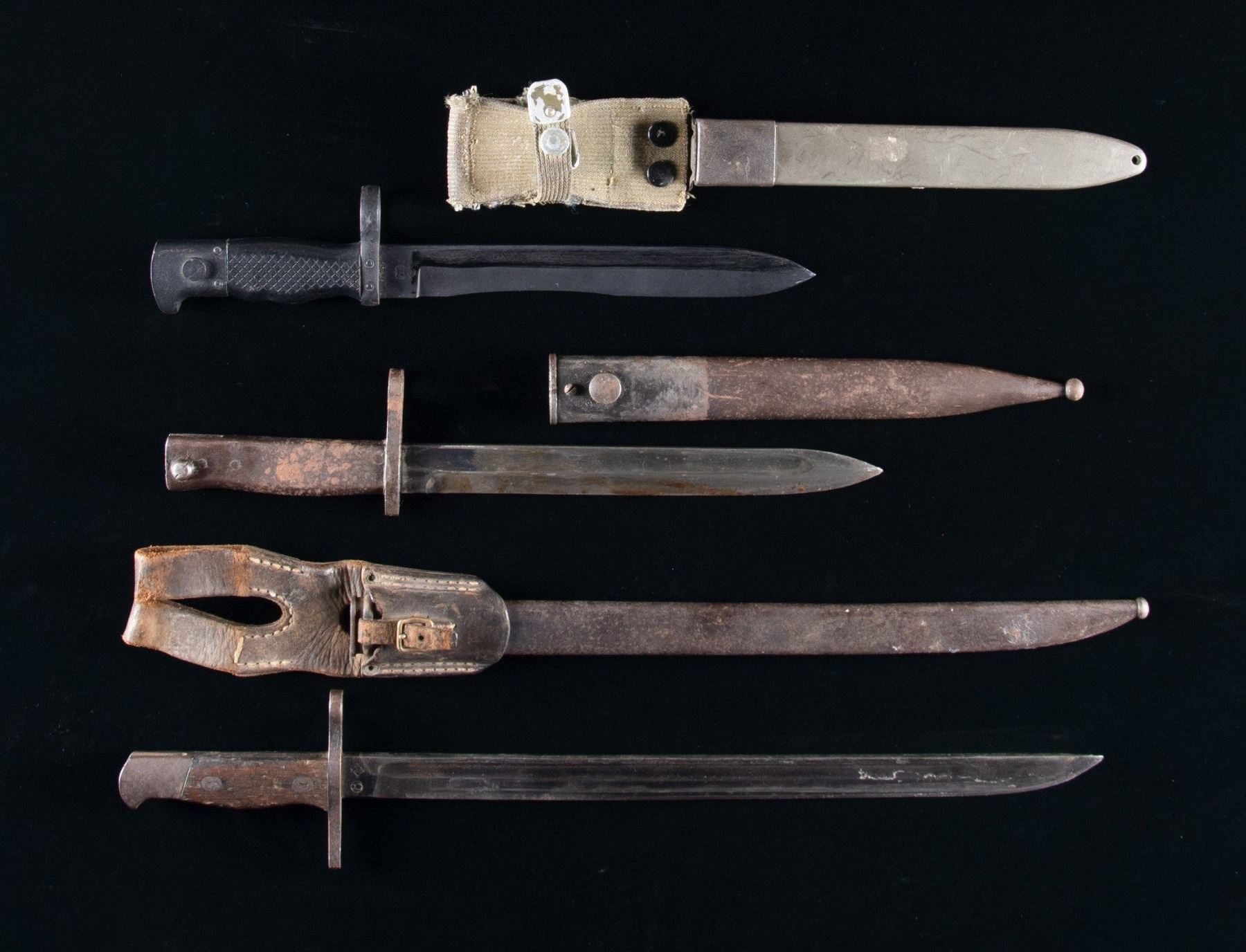 This lot consists of the following bayonets: 1) Japanese Type 30 Bayonet. Blued blade has Toyoda Automatic Loom Works under Nagoya supervision markings. Straight crossguard. Steel scabbard & leather frog present. CONDITION: blade shows scattered edge wear, fading & oxidation. Other parts of bayonet & scabbard are a dull gray color with oxidation. Frog is supple with crazing, flaking, staining & cracking. 2) Spanish CETME Bayonet. Blade has Spanish Toledo crest. Scabbard & frog present. CONDITION: bayonet rates very good overall. Throat of scabbard shows pitting. Scabbard shows scuffing. Frog shows crazing, fraying & staining. 3) Turkish Ersatz Bayonet. All metal construction with 9 1/2" blade & 14" overall length. Bayonet has full muzzle ring & "3922" on crossguard that appears Turkish. No other visible markings. Scabbard present. CONDITION: metal & scabbard show overall flaking & oxidation with some dings & dents. (02-25086/MJC). NON-GUN. $300-500 for lot.