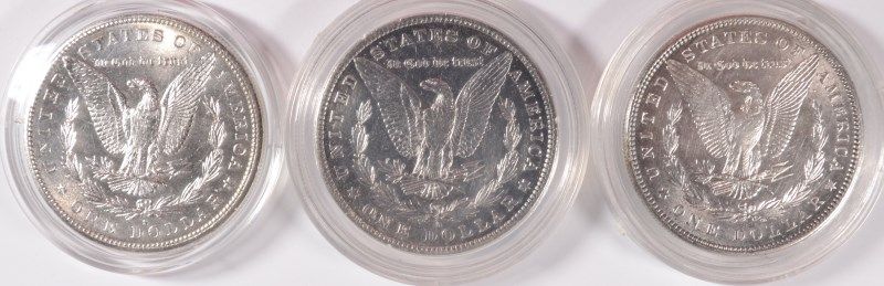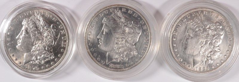 LOT OF 3 AU/BU MORGAN DOLLARS CLEANED 1885, 1883-O, 1879-S