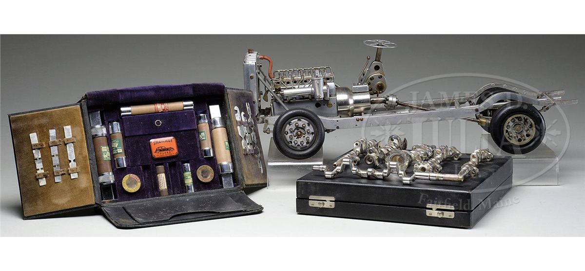Lot includes a polished aluminum automotive skeleton with the engine exposed on black rubber tires. Lot also includes two salesman sample cases, one containing fuses by M. C. Carroll (missing two fuses) and the other containing other automotive parts. SIZE: Car measures 23" l x 8-1/2 w. CONDITION: Good to very good. Fuse case shows some damage and mildew. 1-13572