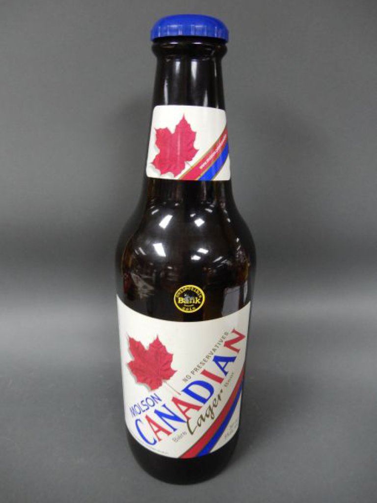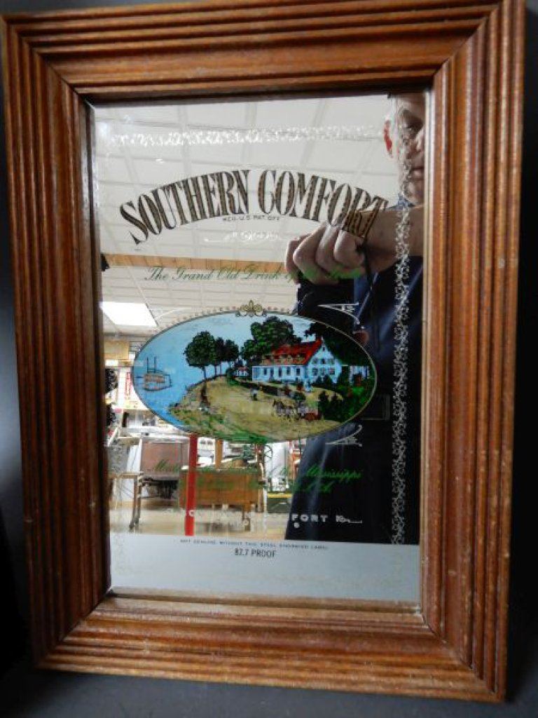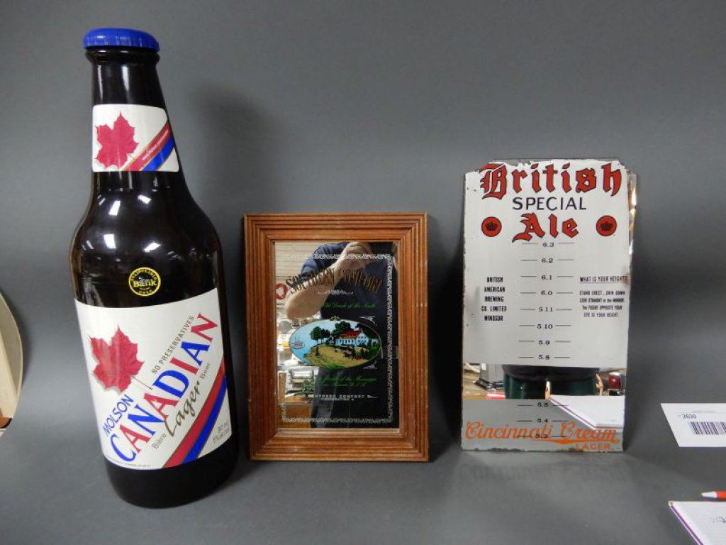 LOT OF 3 BEER COLLECTIBLES MOLSON CANADIAN COIN BANK BOTTLE - BRITISH ALE MIRROR - DAMAGE ALONG THE TOP - SOUTHERN COMFORT MIRROR LOCATION: LOWER RIGHT