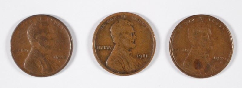 LOT OF ( 3 ) BETTER DATE LINCOLN CENTS, 1911-S F, 1922-D VG, 1926-S VF