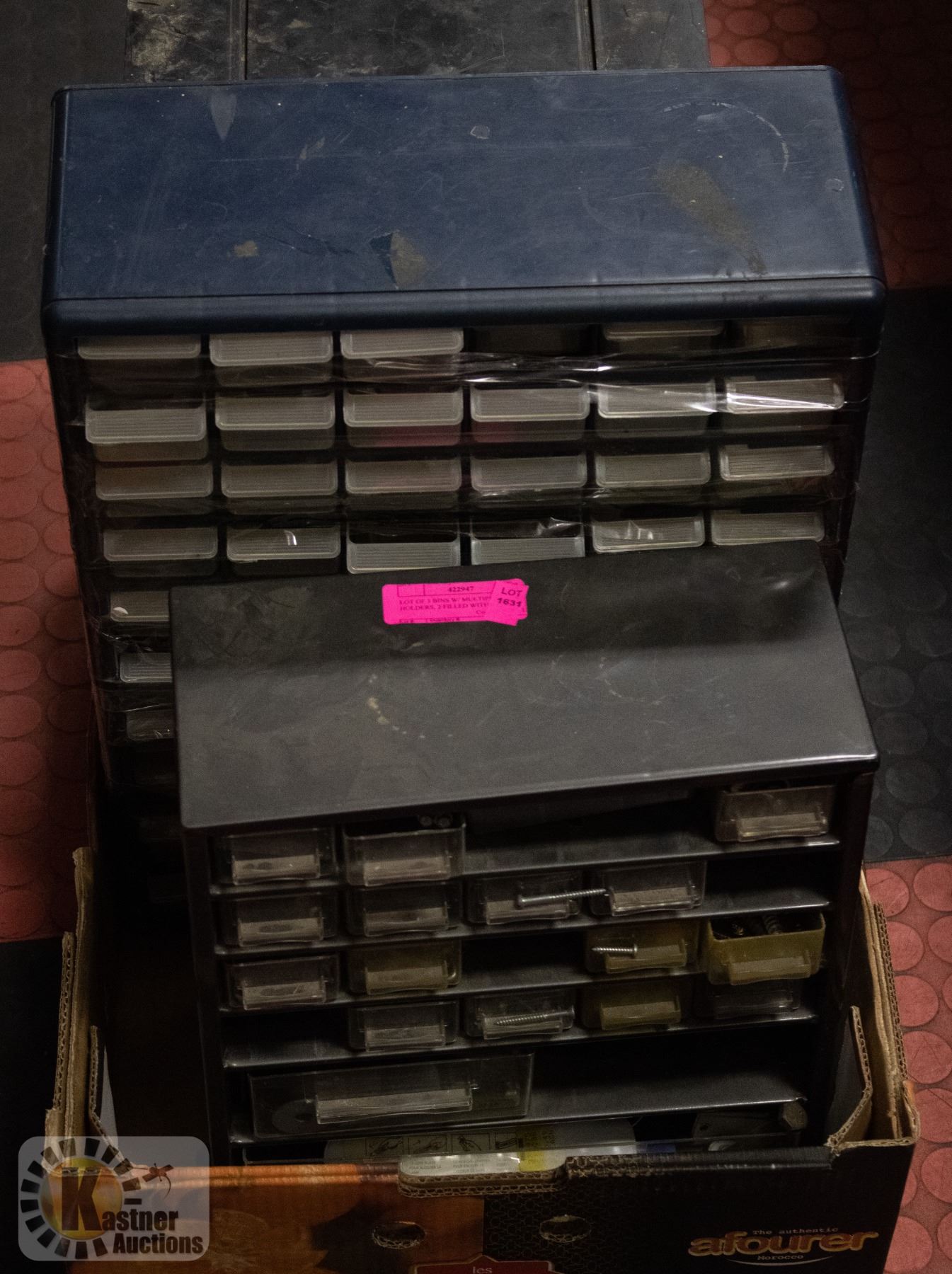 LOT OF 3 BINS W/ MULTIPLE HOLDERS, 2 FILLED WITH