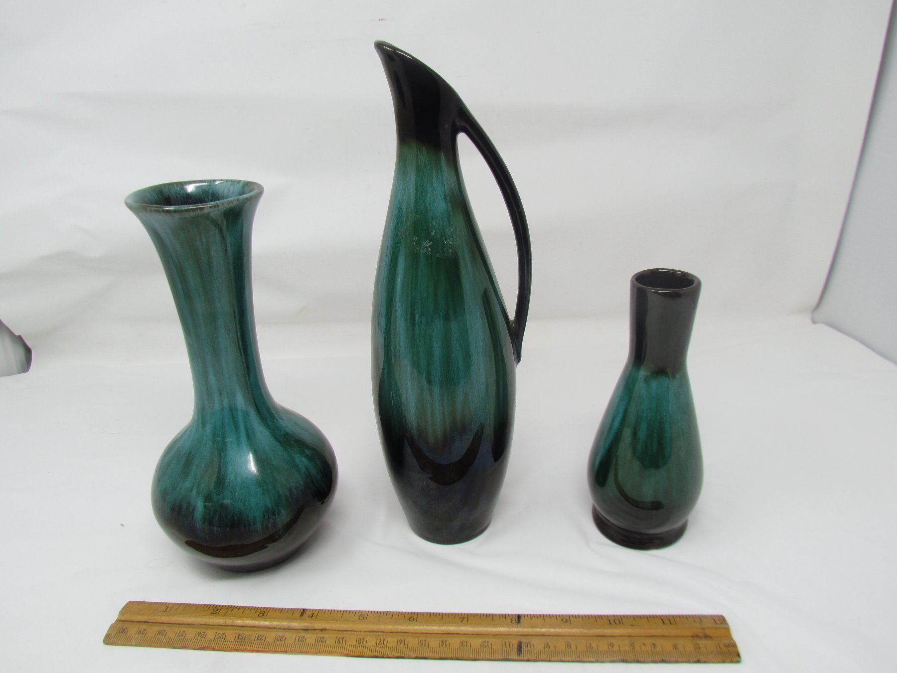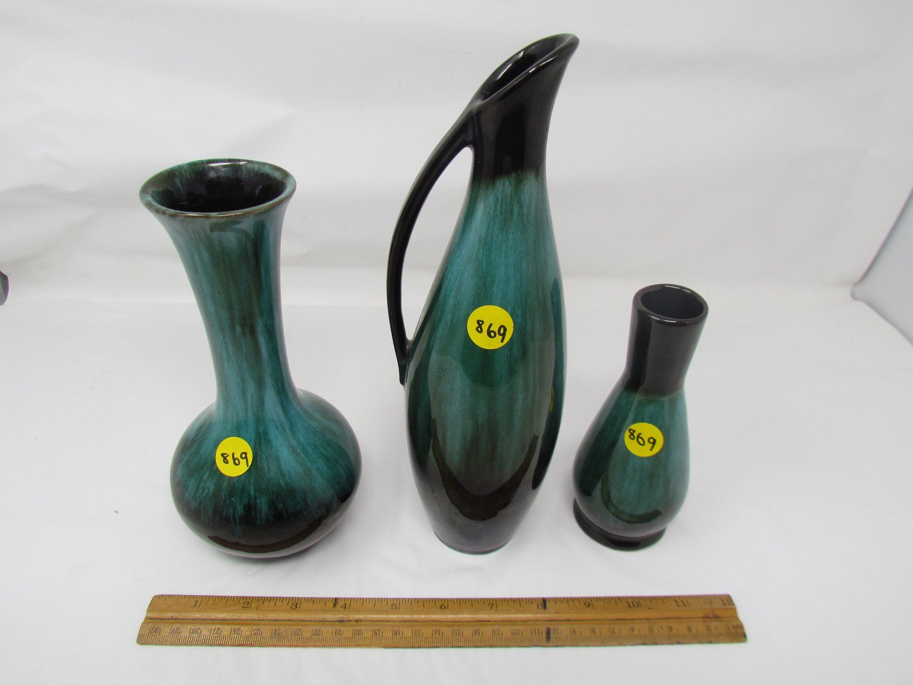 LOT OF 3 BLUE MOUNTAIN VASES (1-10 INCHES, 2-8 1/2 INCHES, 3-6 INCHES HIGH) *NO CHIPS OR CRACKS*