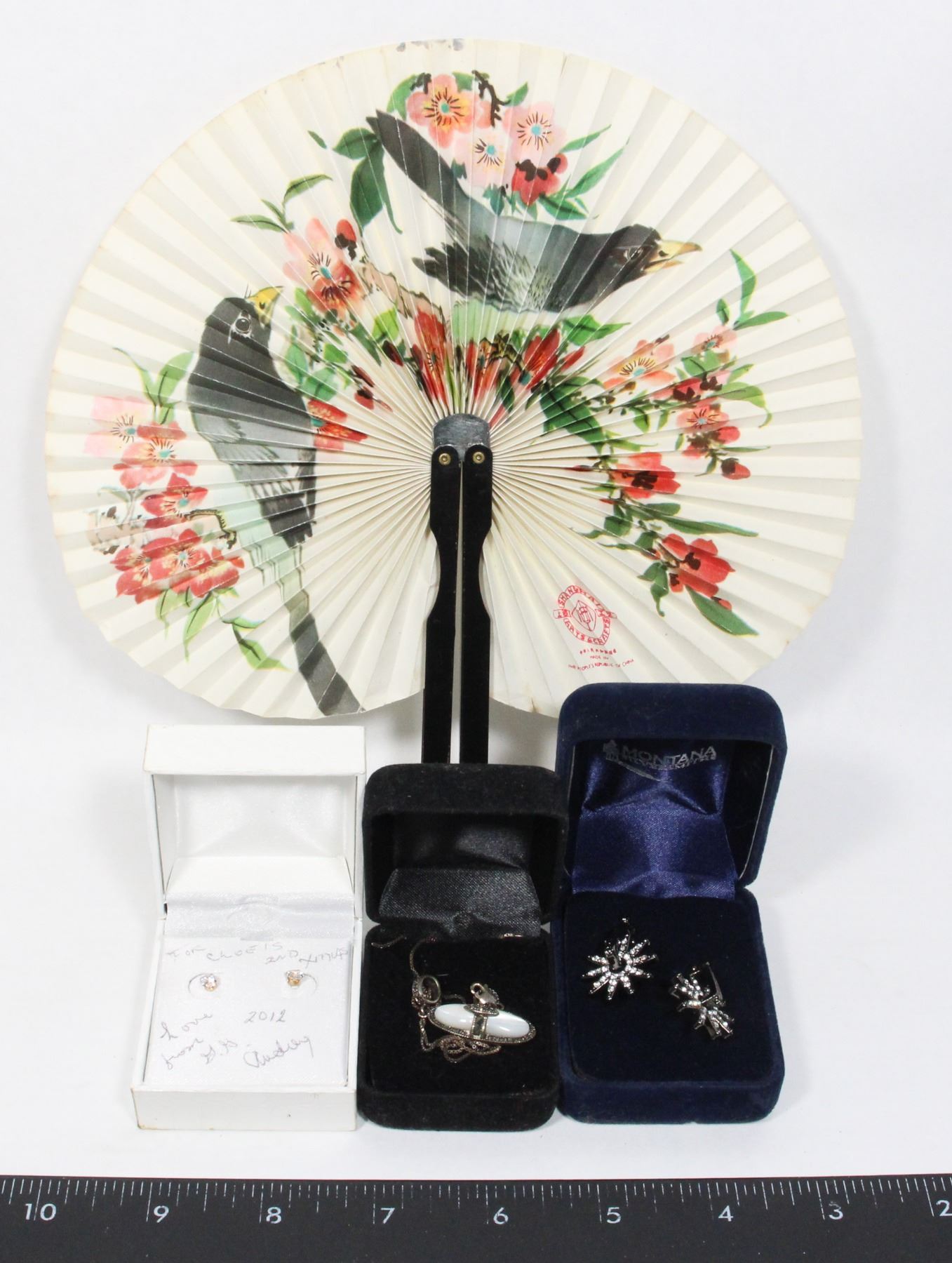 LOT OF 3 BOXES OF JEWELRY AND CHINESE FAN