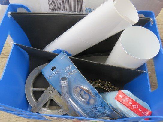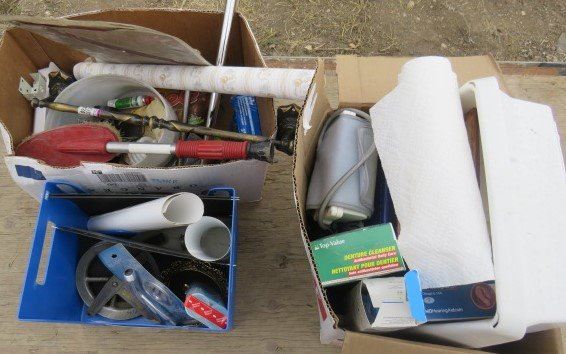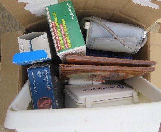 LOT OF 3 BOXES OF MISC BATH AND HOUSE WARES (FOOT BATH, HEARING AID BATTERIES, POLYDENT, ETC)