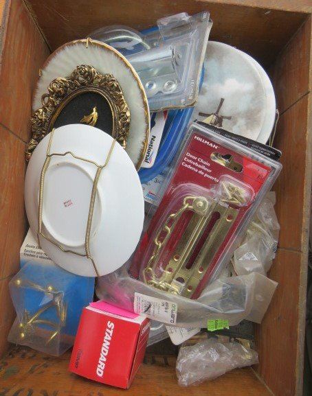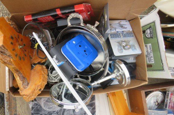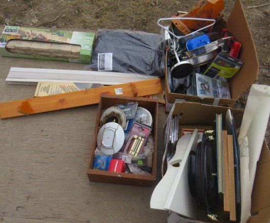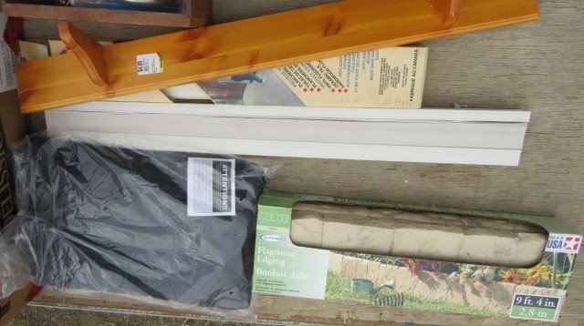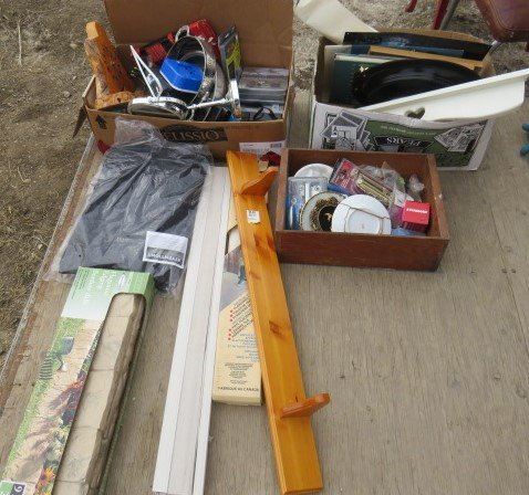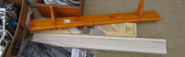 LOT OF 3 BOXES OF MISC HOUSEHOLD ITEMS (WOOD SHELF, BLIND, BOX OF FLAGSTONE EDGING, ETC)