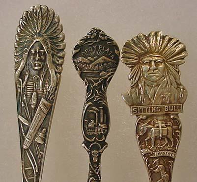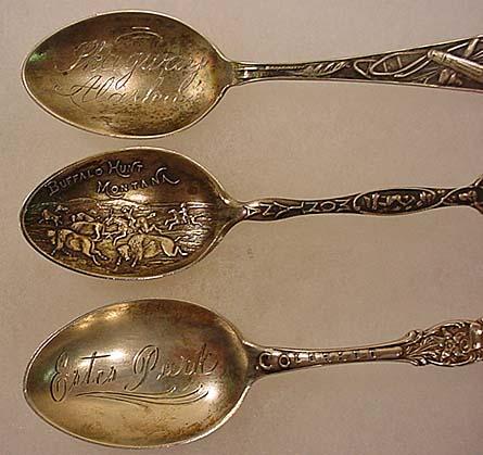 LOT OF 3 C. 1900 STERLING SILVER SOUVENIR SPOONS - Buffalo Hunt Montana, Skagway Alaska with Indian and Estes Park Colorado with Sitting Bull.