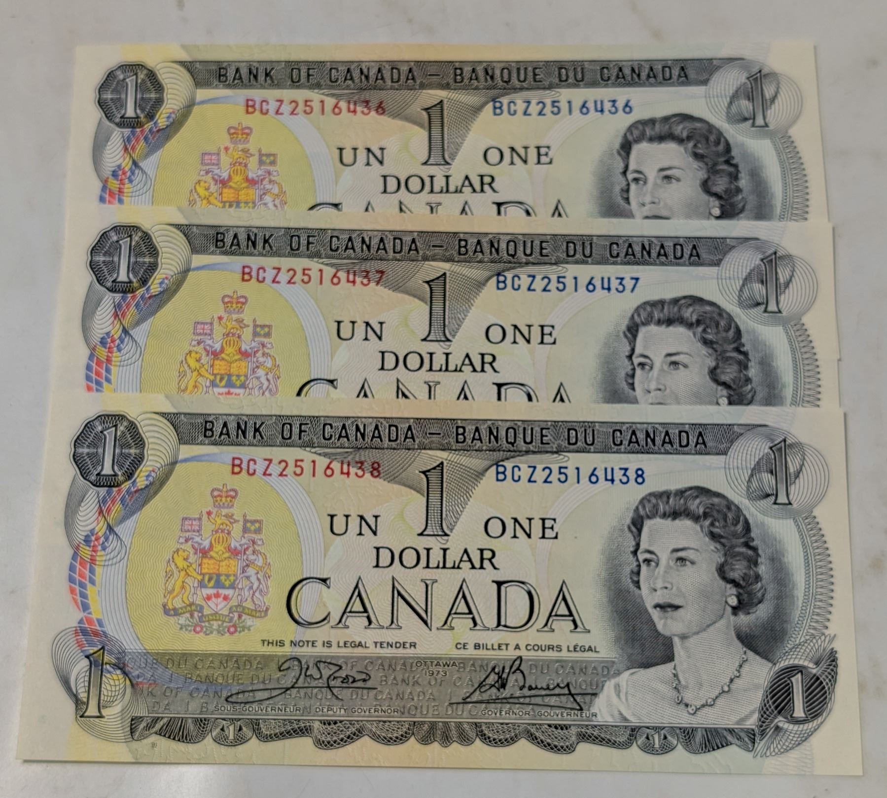LOT OF 3 CANADA 1973 UNC CONSEC $1 BANKNOTES