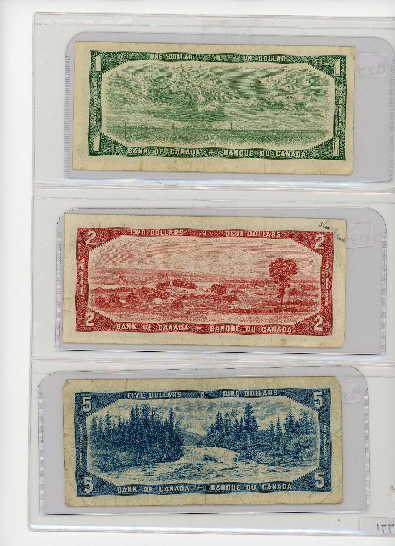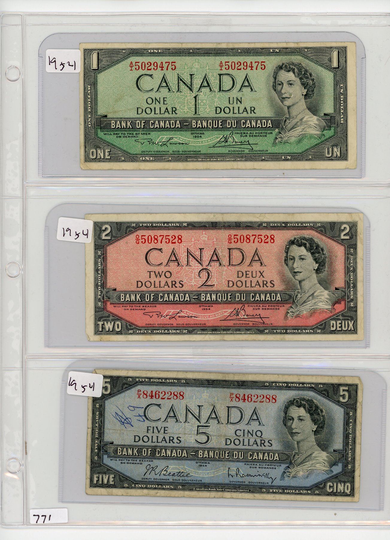LOT OF 3 CANADIAN BANKNOTES (1-2-5 DOLLAR BILLS ) *1954*